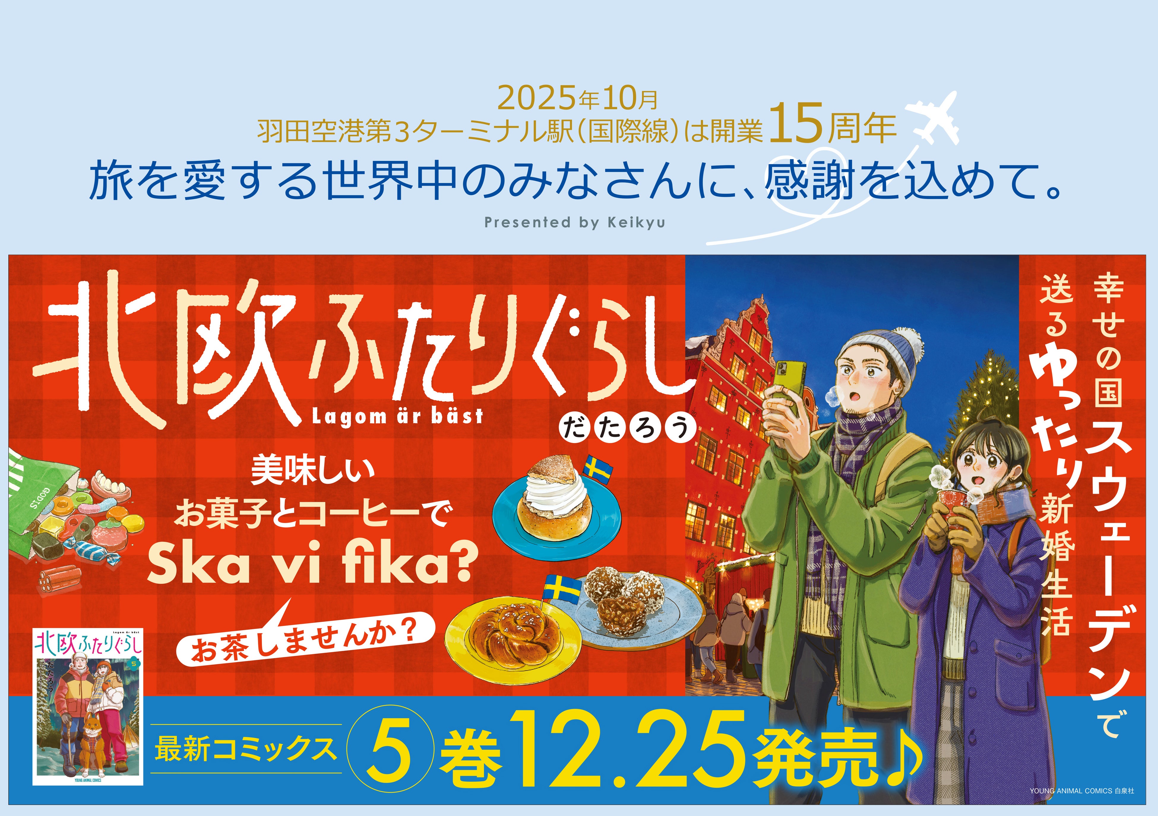 スウェーデン移住した新婚夫婦の生活をえがいた大人気コミックス『北欧ふたりぐらし』とコラボした中づり広告ができました。