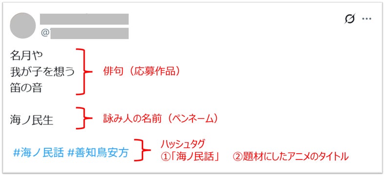 (3)Xにて、「俳句(応募作品)」と「詠み人の名前(ペンネーム)」に、2つのハッシュタグ「#海ノ民話」と「#(題材にしたアニメのタイトル) 」の付けて投稿