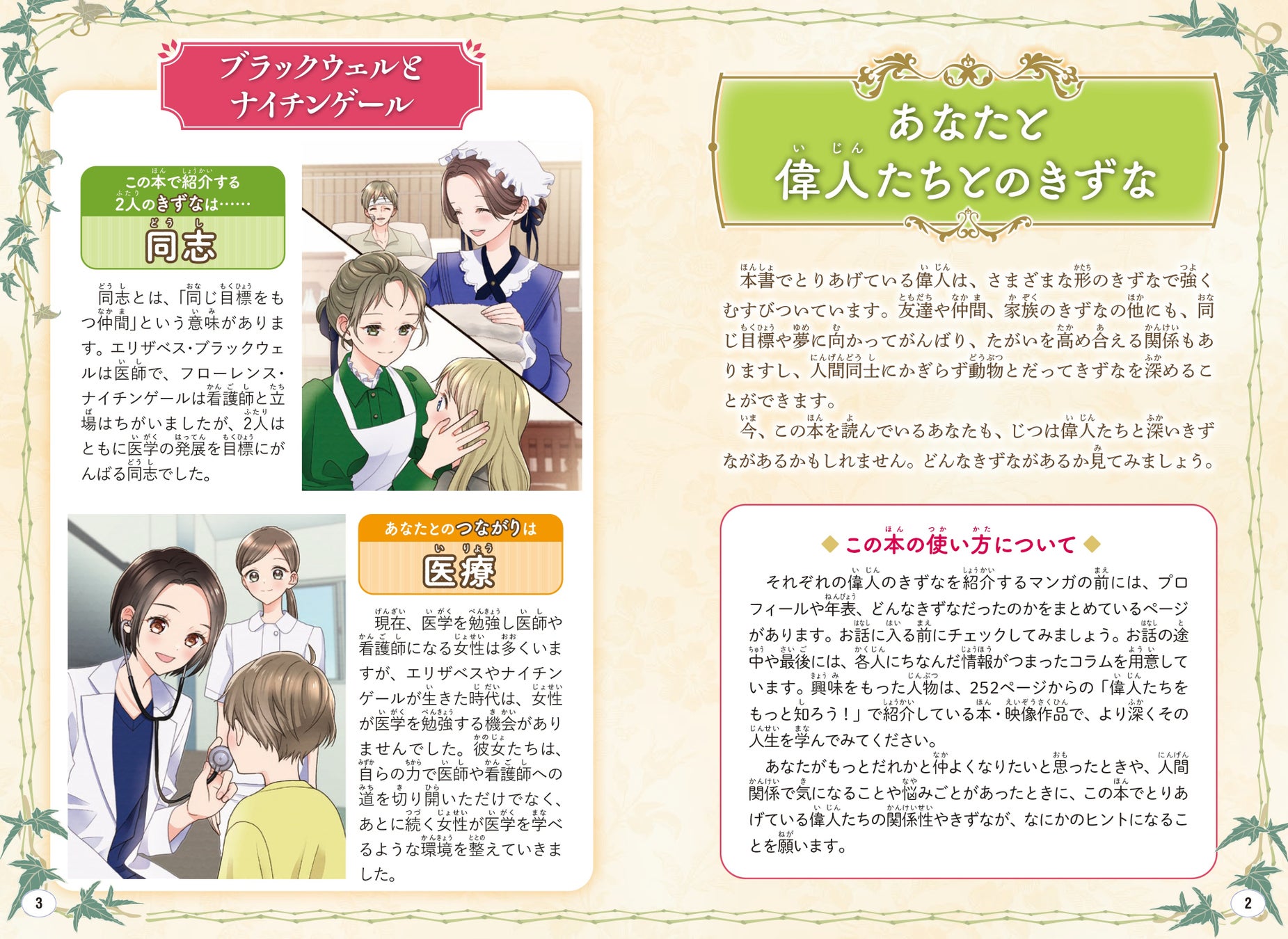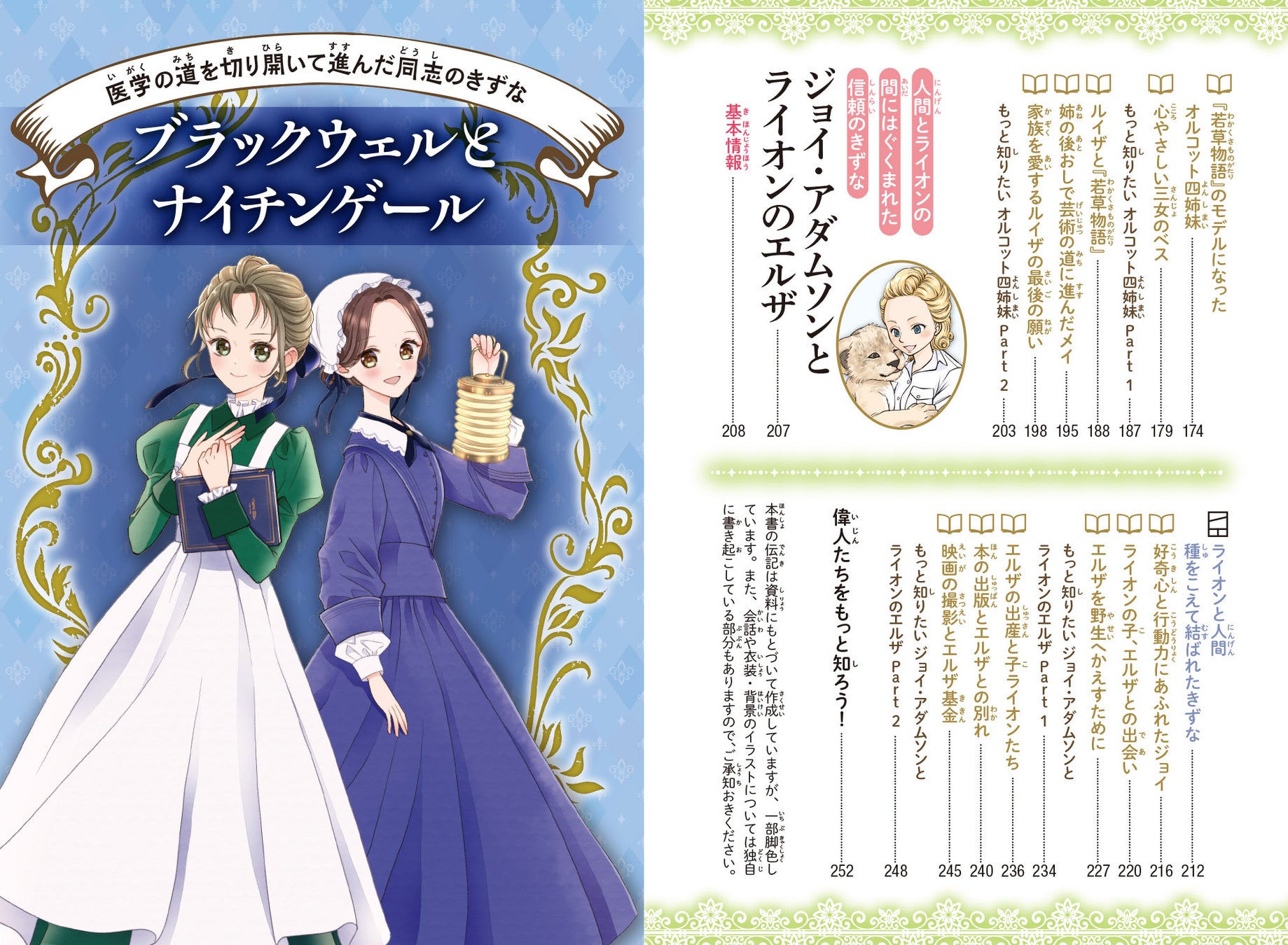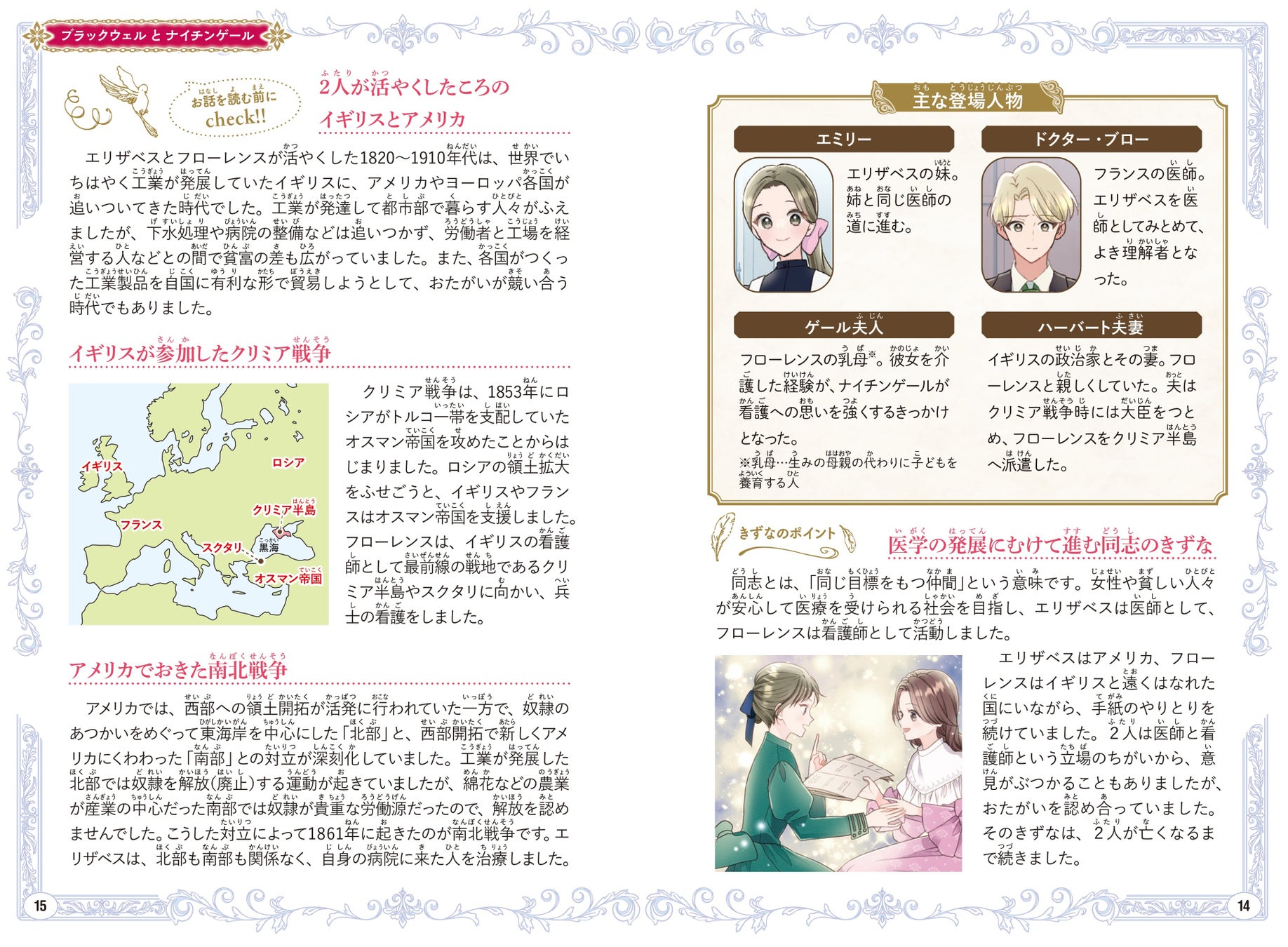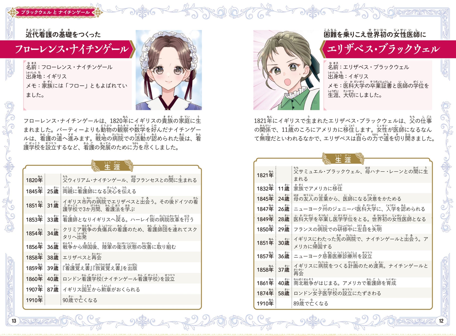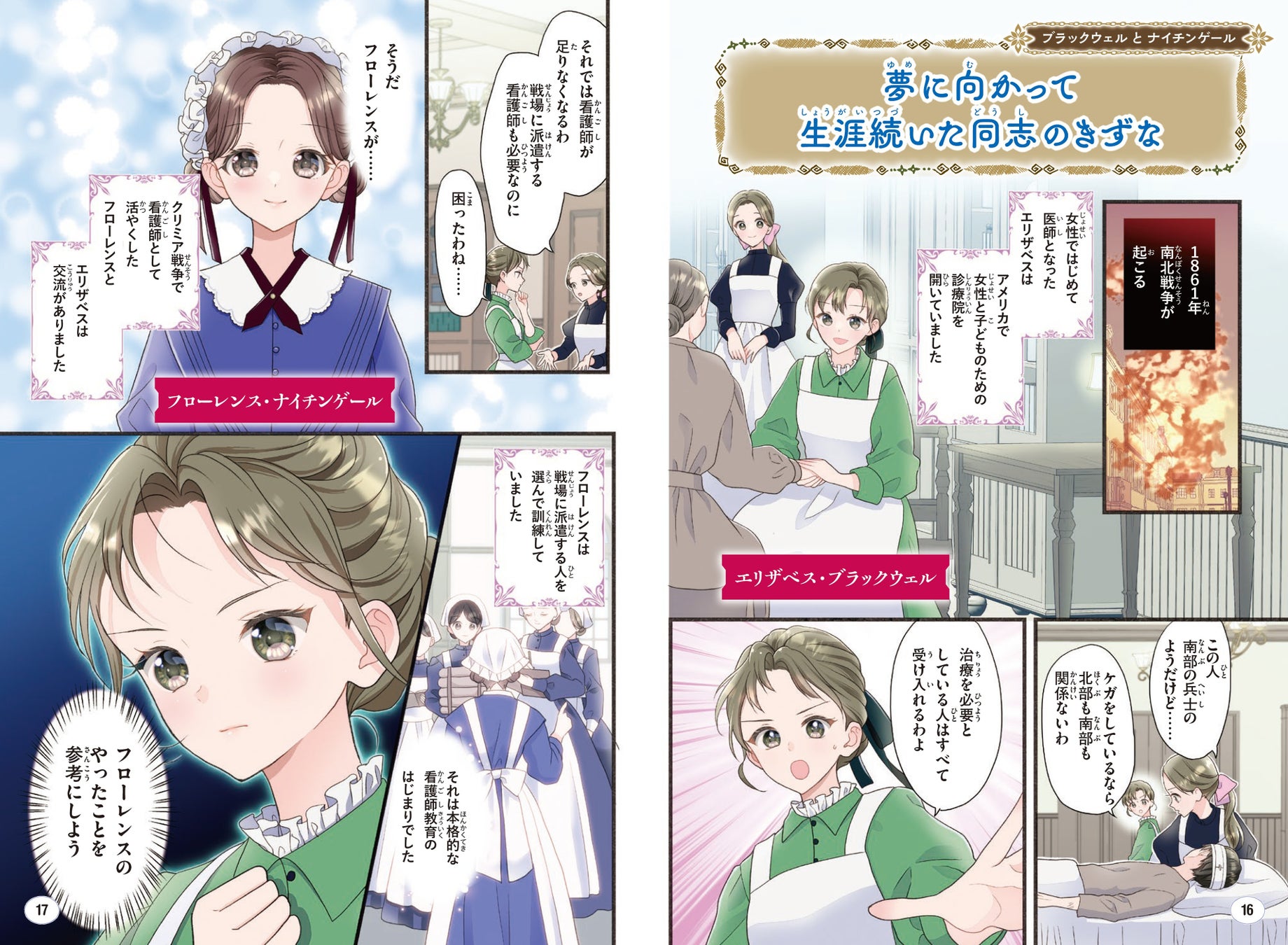 困難をのりこえ、世界初の女性医師になったエリザベス・ブラックウェルと、近代看護の基礎をきずいたフローレンス・ナイチンゲール。