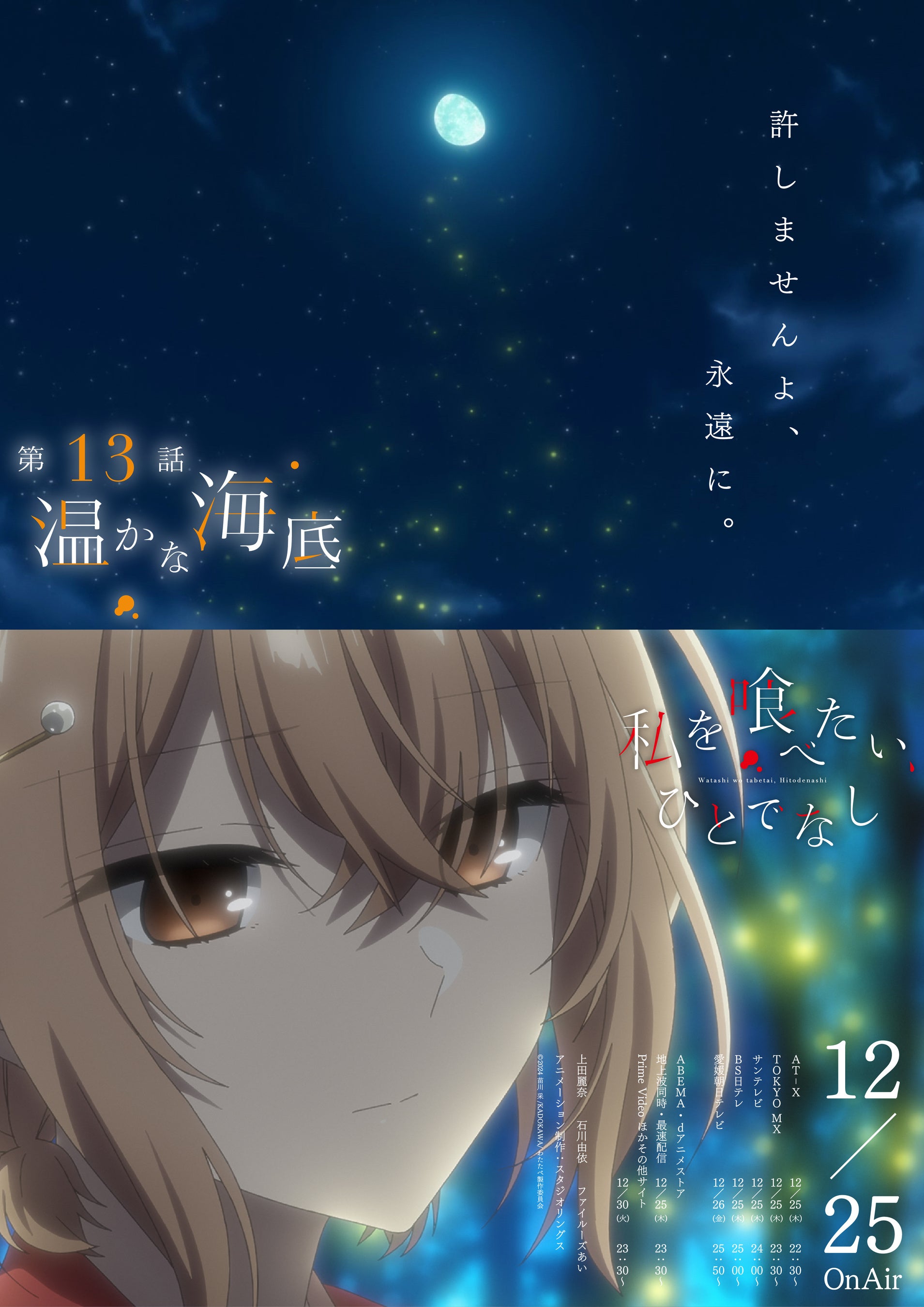 公開された予告映像では、比名子、汐莉、美胡の声とともに、無数の言葉たちが深い海の底から次々と湧き上がり、神秘的な世界観を描き出しています。また、第13話の場面カットを使用したポスターは、それぞれが異なる2枚のカットで構成され、添えられた印象的な言葉が物語への期待を一層高める”エモーショナル”な仕上がりとなっています。
