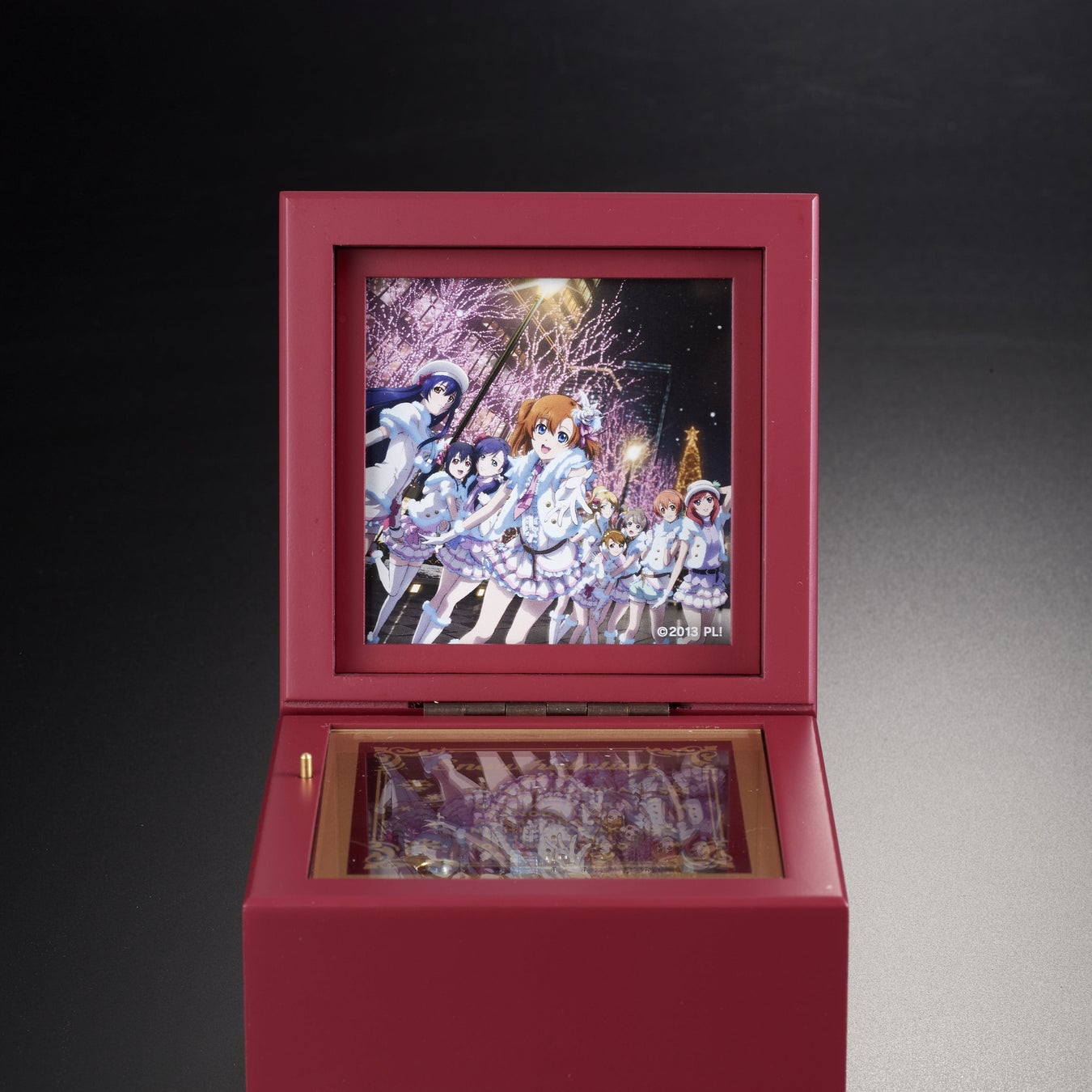本商品は、『ラブライブ!』の2ndシングルCDとして発売され大ヒットした「Snow halation」のメロディーを奏でるオルゴールです。蓋の内側には「Snow halation」のステージ衣装を纏ったμ‘sメンバーのイラストがあしらわれています。BOXを開けるとガラス製の蓋を通して金メッキのメカが見える豪華仕様のオルゴールです。