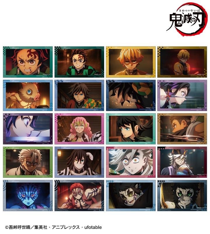 竈門炭治郎、我妻善逸、嘴平伊之助、冨岡義勇、胡蝶しのぶ、甘露寺蜜璃、時透無一郎、悲鳴嶼行冥、不死川実弥、伊黒小芭内、童磨、猗窩座、獪岳の印象的なシーンをアクリルカードに仕上げました。