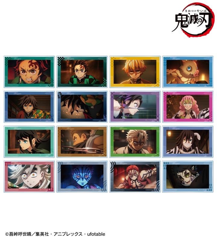 竈門炭治郎、我妻善逸、嘴平伊之助、冨岡義勇、胡蝶しのぶ、甘露寺蜜璃、時透無一郎、悲鳴嶼行冥、不死川実弥、伊黒小芭内、童磨、猗窩座、獪岳の印象的なシーンをアクリルカードに仕上げました。