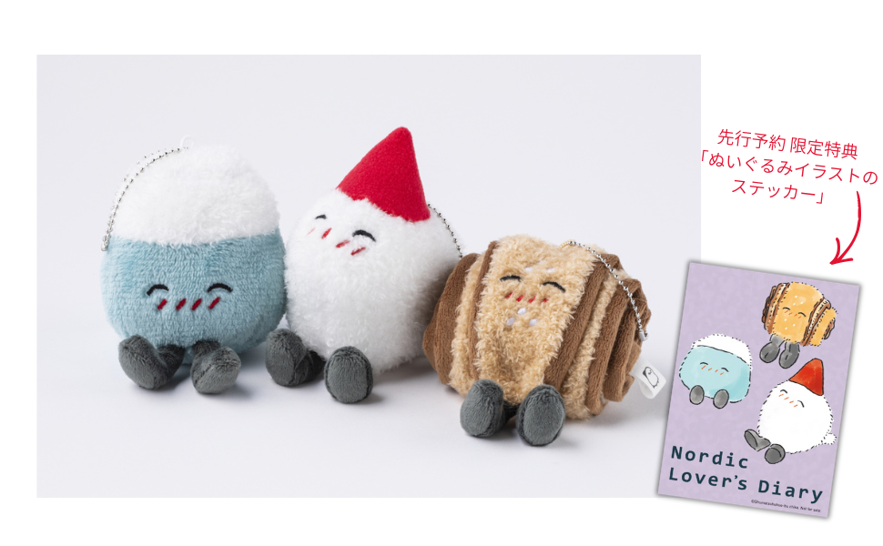 先行予約を記念して、限定特典「ぬいぐるみイラストのステッカー」(縦75mm×横55mm)付きの特別セット。『北欧こじらせ日記』シリーズに登場する「かもめ」「シナモンロール」「ふじさん」の3モデルです。1つでも可愛いけど、3つのキャラクターが揃うと、さらに可愛い!!「北欧こじらせ」シリーズの世界観が広がります。