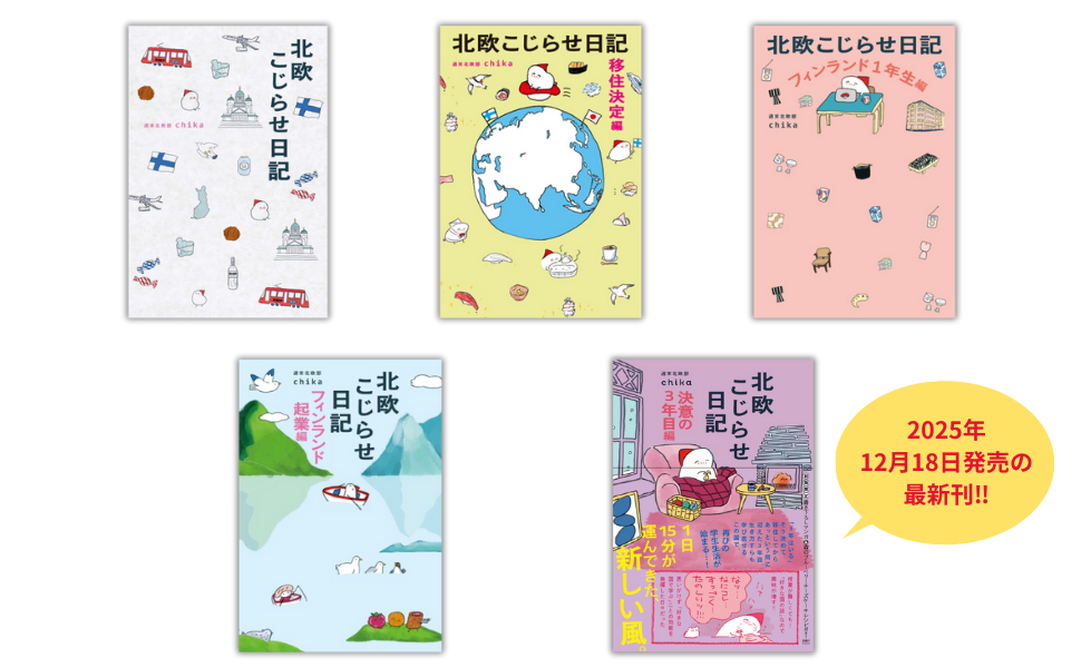 『北欧こじらせ日記』シリーズは、北欧「フィンランド」の魅力にとりつかれた一人の会社員が、「北欧好き」を拗らせながらも、自分らしい人生を探し続ける姿を描いたコミックエッセイシリーズ。12年以上フィンランドに通い続けた”フィンランド愛”が高じて、とうとう”フィンランドで寿司職人になる”という予想外の夢へと踏み出していきます。待望の第5弾『北欧こじらせ日記 決意の3年目編』(2025年12月18日発売)では、いよいよ著者が寿司職人としてフィンランド移住の夢を現実にした後の物語へ。職場倒産という大きな逆境に直面しながらも、「1日15分、自分が嬉しくなれる未来のために」という小さな積み重ねを大切にし、そこから新しい風が吹き始めます。