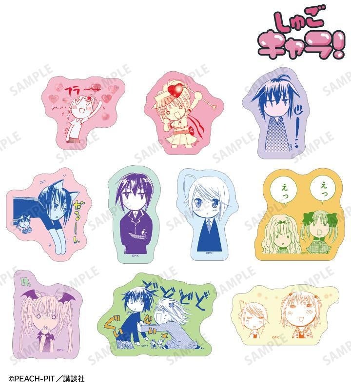 日奈森 あむ、月詠 イクト、辺里 唯世、藤咲 なぎひこ、結木 やや、相馬 空海、藤咲 なでしこ、真城 りま、ラン、ミキ、スゥ、アミュレットハート、ルナティックチャームの原作コマイラストをフレークシールに仕上げました。