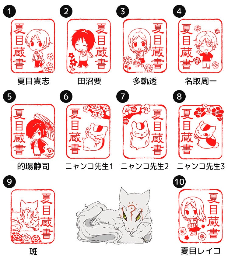 ニャンコ先生はもちろん、ニャンコ先生の本来の姿である斑(まだら)や物語の主人公である夏目貴志や友人たちまで。コミックや愛読本はもちろん、お手紙にもポン!と趣を添えます