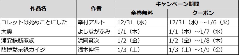 さらに、対象作品が最大27巻無料で読める年末年始限定企画も同時開催!~12月31日から1月3日は毎日対象作品が全巻無料!!~