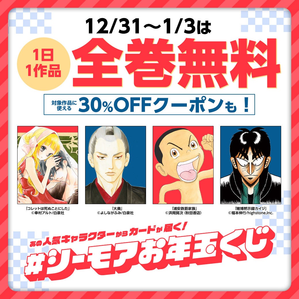 12月31日(水)~1月3日(土)の4日間限定、1作品ずつ日替わりで24時間限定全巻無料。さらに、対象作品に使える30%OFFクーポンも実施しています。