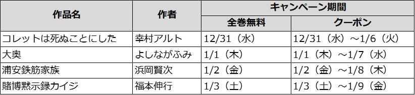 さらに、対象作品が最大27巻無料で読める年末年始限定企画も同時開催!~12月31日から1月3日は毎日対象作品が全巻無料!!~