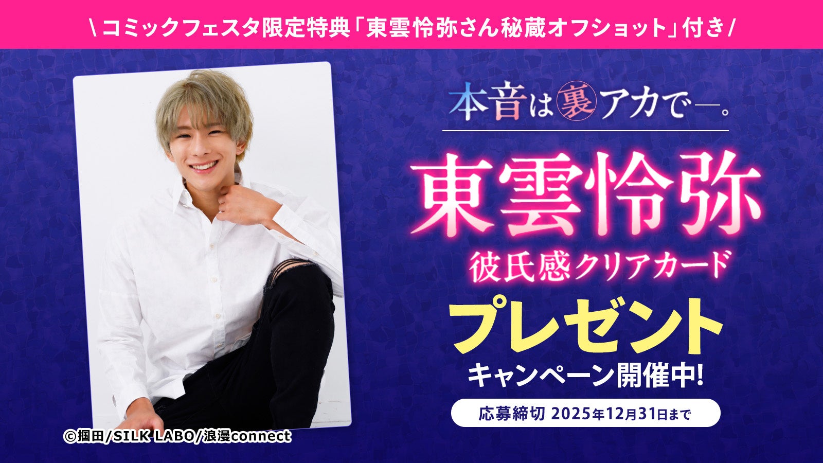 配信開始を記念して、ComicFestaでは、非売品グッズ「東雲怜弥 彼氏感クリアカード」が抽選で当たるプレゼントキャンペーンを12月30日(火)まで開催中!