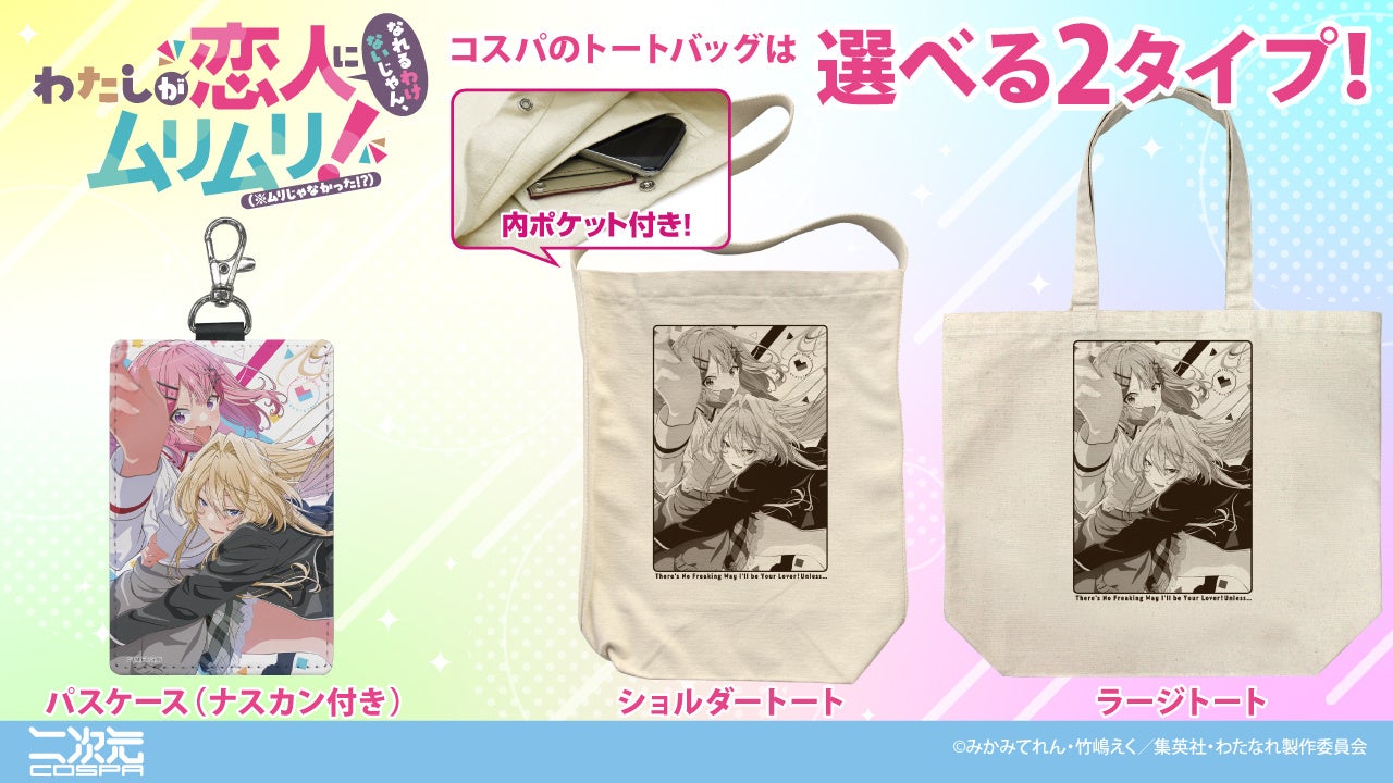 公式キャラクターコスチュームやアパレル・グッズの企画、開発、製造を行う株式会社コスパ(所在地:東京都渋谷区、代表取締役:松永芳幸)は、TVアニメ『わたしが恋人になれるわけないじゃん、ムリムリ!(※ムリじゃなかった!?)』新グッズを発表した。