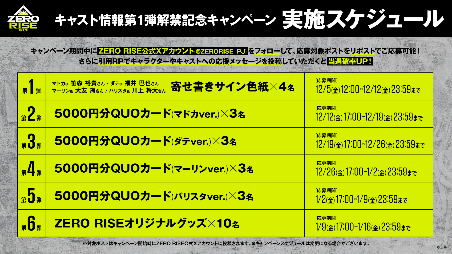 キャンペーン期間中にZERO RISE公式Xアカウント(https://x.com/ZERORISE_PJ)をフォローして、応募対象ポストをリポストでご応募可能です。