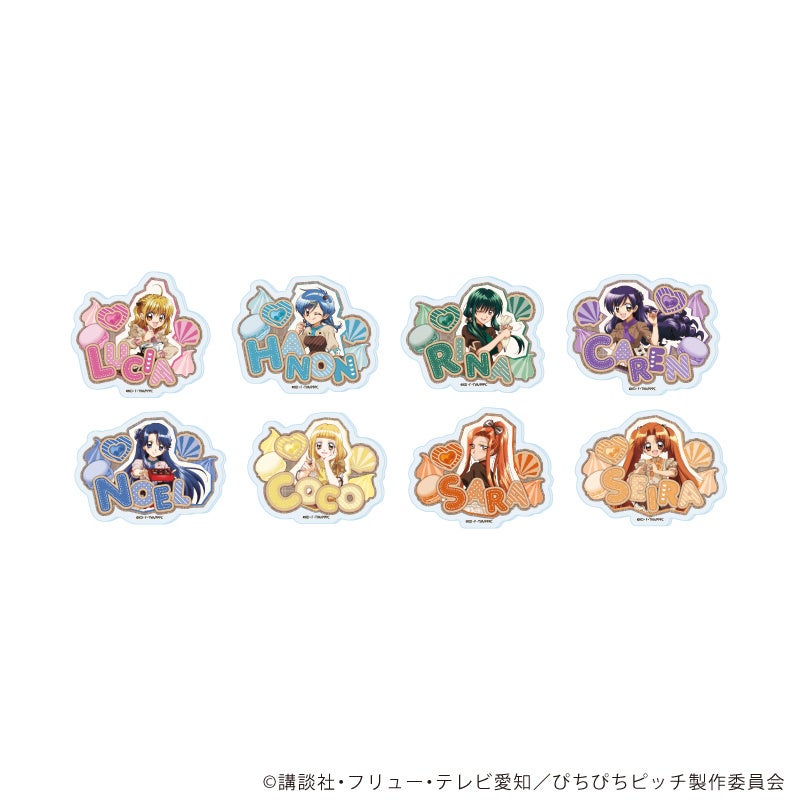 存在感抜群のアクリル製バッジ。るちあ、波音、リナ、かれん、ノエル、ココ、沙羅、星羅の名前がポップ&キュートにデザインされています!