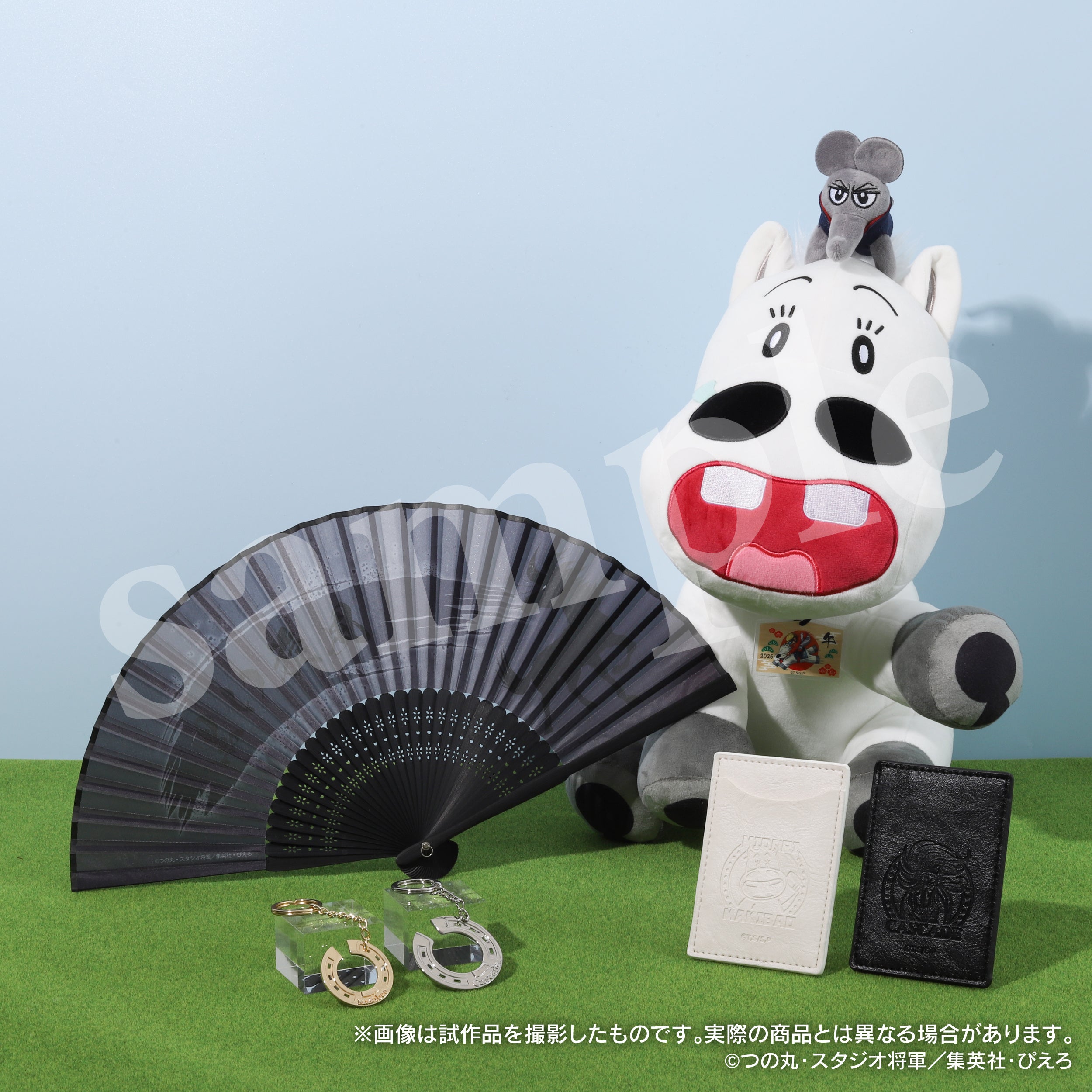 漆黒の帝王カスケードが巻き起こした“黒い旋風”をイメージした扇子やマキバオーやカスケードの“蹄鉄”をモチーフにしたメタルチャームなど、作品ならではのデザインを盛り込んだ商品がラインナップ!さらに、実際の競馬観戦でも使用できる馬券ケースも登場。世界観をしっかり感じられるアイテムに加え、チュウ兵衛が乗ったキュートなぬいぐるみセットやイラストが大きく乗った証明写真館も発売決定!