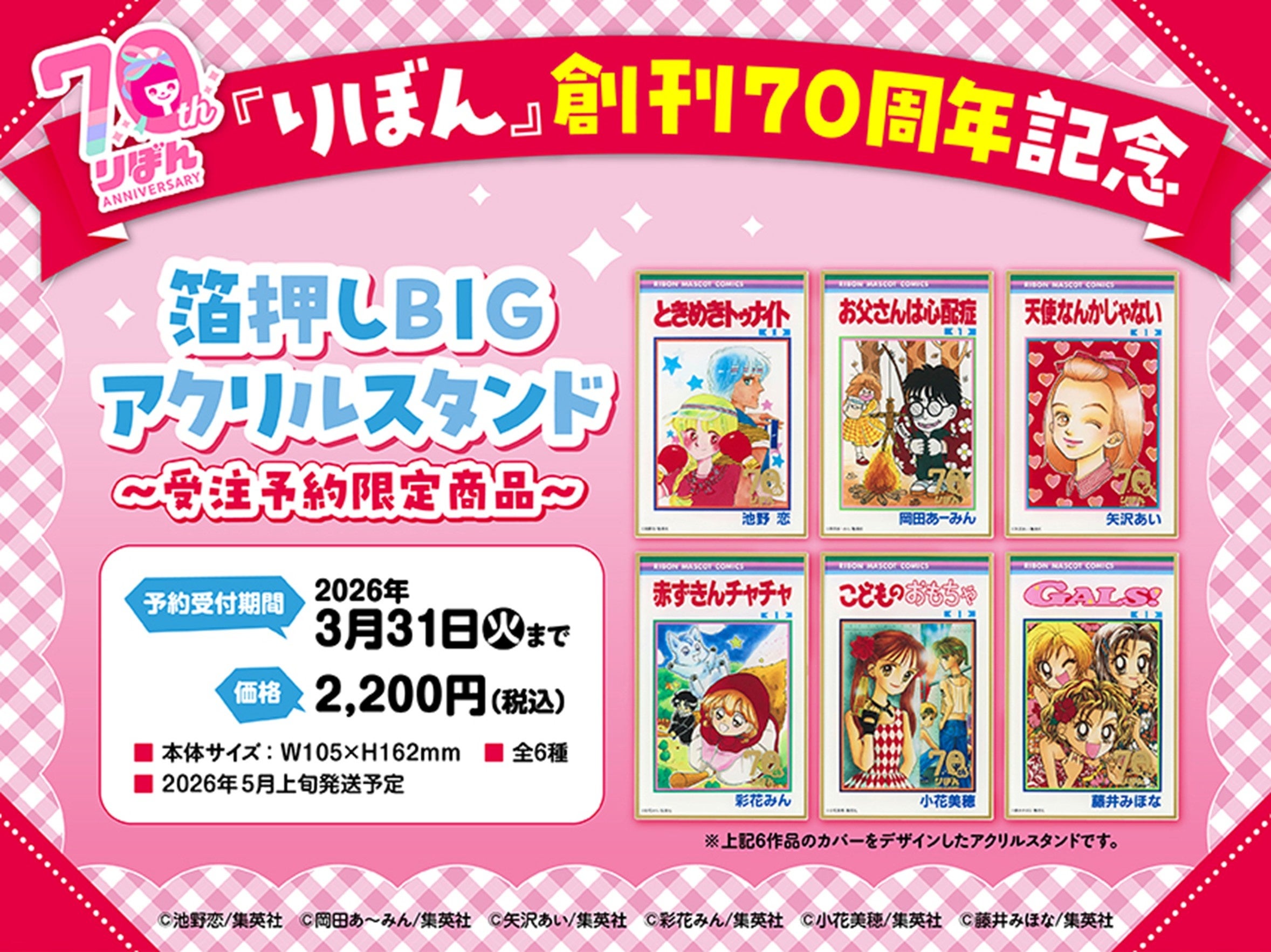 『りぼん』の名作6作品の1巻の書影に、箔押しの“りぼん70周年ロゴ”を刻印した未来屋書店限定のオリジナルアクリルスタンドを完全受注生産販売します。