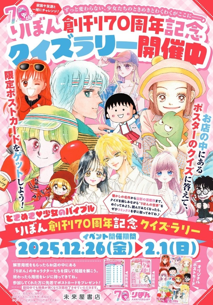 株式会社未来屋書店(千葉県千葉市、代表取締役社長:平川雅隆)は、創刊70周年を迎えた集英社の少女まんが雑誌『りぼん』とのコラボキャンペーンを12月26日(金)より開催します。