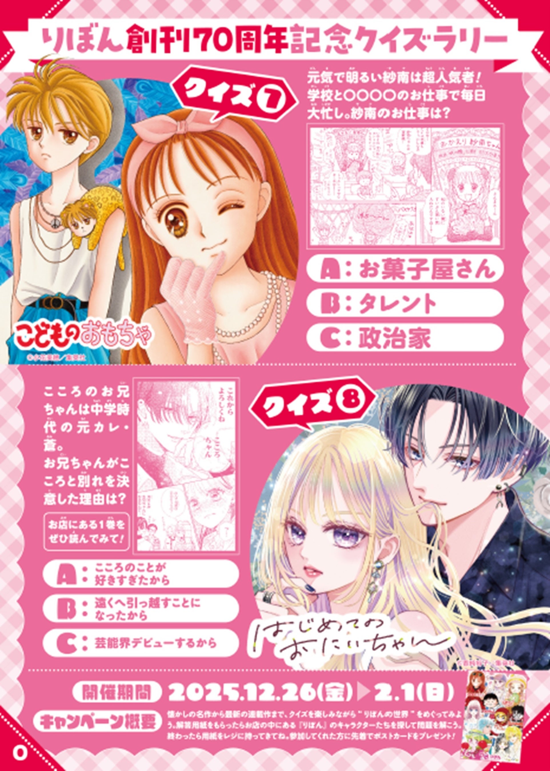 懐かしの名作から最新の人気作まで、クイズを楽しみながら『りぼん』の世界をめぐっていただけます。クイズをきっかけに新しい作品との出会いも広がります。