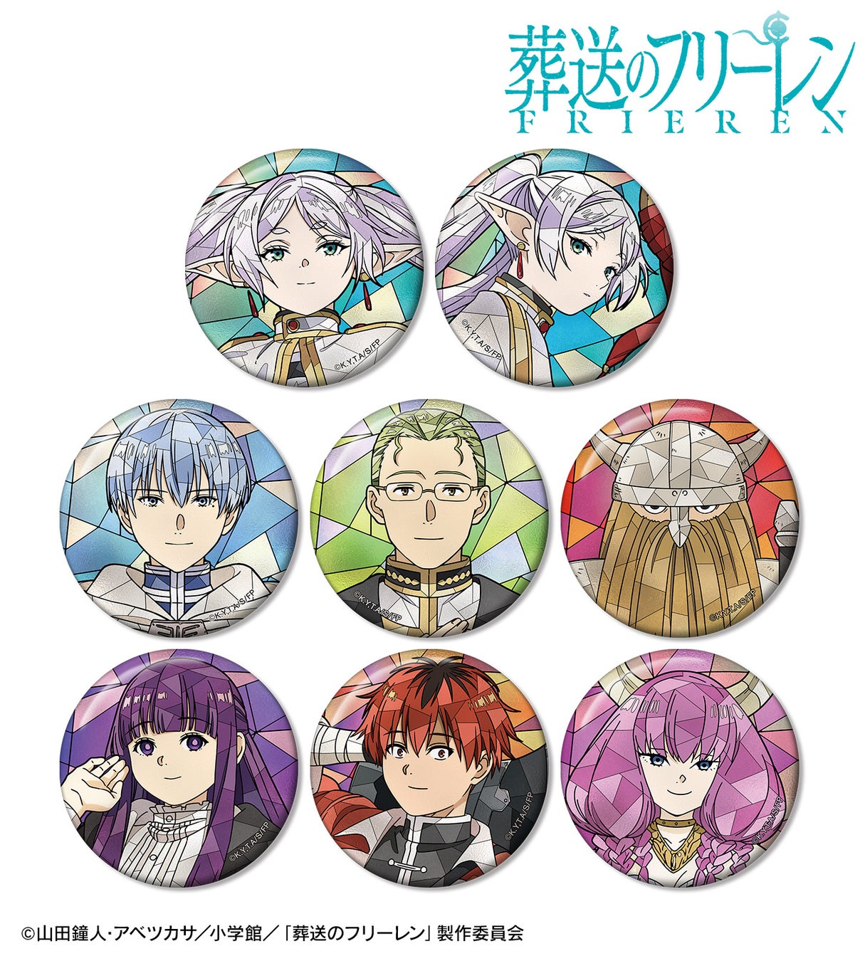 フリーレン、ヒンメル、ハイター、アイゼン、フェルン、シュタルク、断頭台のアウラのイラストを新たなタッチで魅力的に表現し、缶バッジに仕上げました。