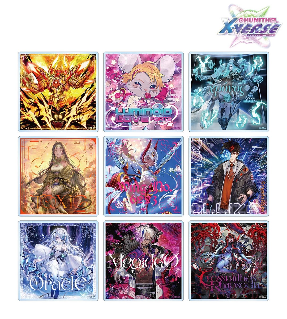 神鳴、luminoid love PART2、χρόνος、TOXIC、Wing:No.6223、Crystallize、Oracle、MegiddØ、Crossmythos Rhapsodiaの楽曲ジャケットイラストをアクリルコースターに仕上げました。