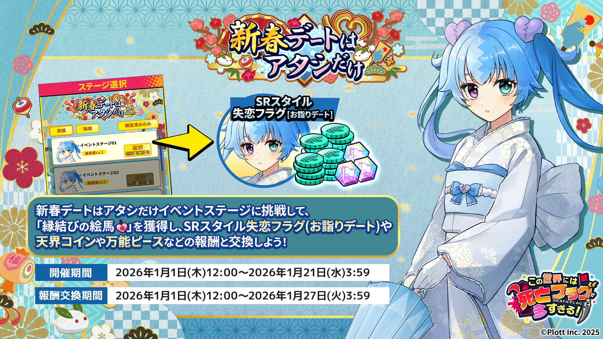 IPコンテンツの企画・制作・ビジネス展開を行う株式会社Plott(本社:東京都千代田区、代表取締役:奥野翔太、以下「Plott」)は、Plott Gamesが運営する『この世界には死亡フラグが多すぎる!』にて、期間限定の正月イベント「新春デートはアタシだけ」を開催することをお知らせいたします。