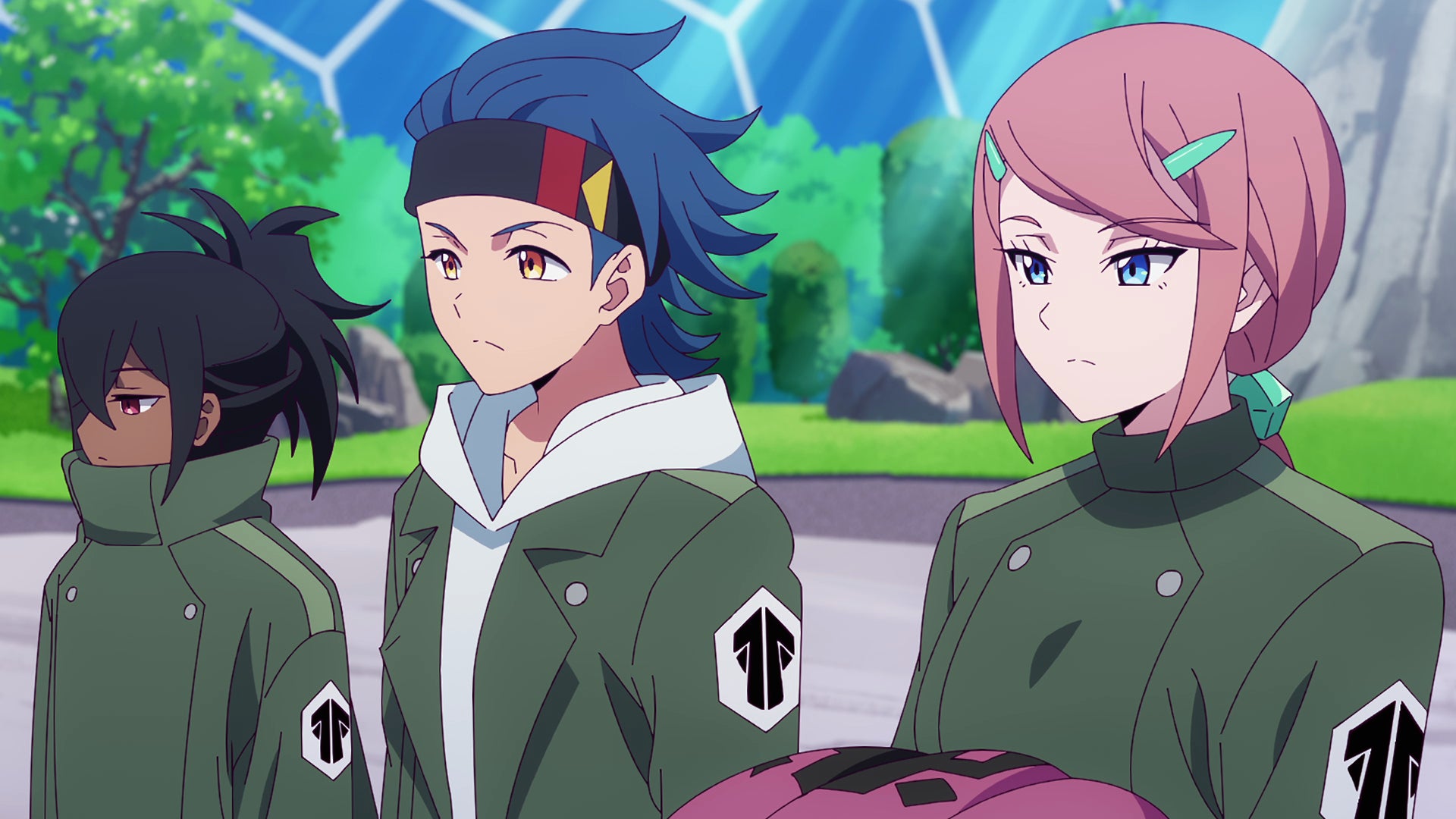 タクティクスは、クレイの指揮のもとに動く、規律や統率を重視したクリーナーチームです。グローイングドーンが、いい意味で自由でちょっとガチャガチャしたチームだとしたら、タクティクスは軍隊的なチームというイメージですね。服装のカラーリングを揃えて、統一感のある軍服のようなデザインにしつつ、よく見ると一人ひとり微妙に違うディテールが入っている。完全な没個性にはせず、チーム感を出しながらも、それぞれのキャラクター性が伝わるようにデザインしてもらいました。例えば、同じジャケットでも丈やシルエットを少し変えてみたり、アクセサリーや髪型で個性を出してみたり。トモロウたちと並んだときに、シルエットでも関係性が分かるようにしたかったので、ライバル同士のカラーリングの相性や、画面に並んだときのバランスもかなり意識しています。トモロウとライトといった組み合わせがぶつかったときに、ビジュアルでも気持ちよく噛み合うようにしたつもりです。まだ出会って間もない彼らの関係性が、色や形の対比だけでもなんとなく伝わるような画面作りを目指しています。