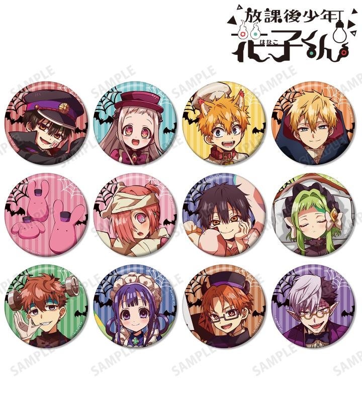 花子くん(吸血鬼の支配人)、寧々(訪問者)、光(人狼のシェフ)、輝(祓魔師)、もっけ(ドアマン)、ミツバ(ミイラの見習いパティシエ)、つかさ(ホテルの幽霊)、桜(お客人)、夏彦(フランケンシュタインのベルボーイ)、葵(妖精のハウスメイド)、茜(悪魔のフロントボーイ)、土籠(コンシェルジュ)のイラストを缶バッジに仕上げました。