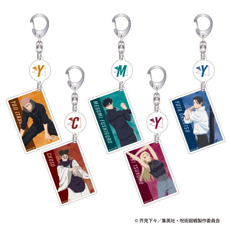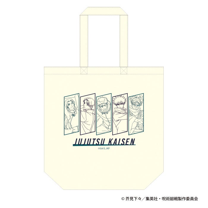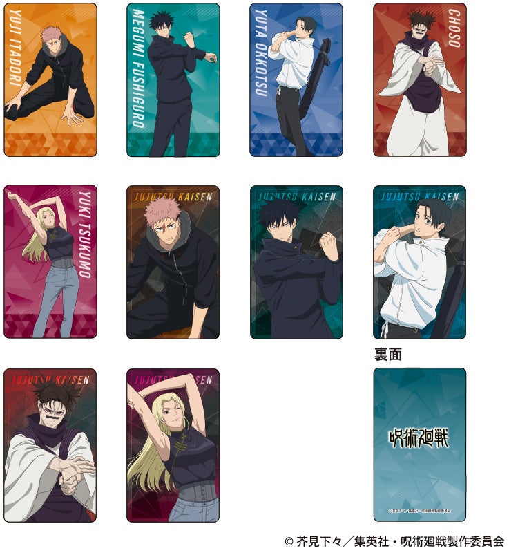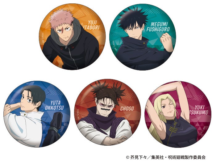 新商品には、ストレッチをしている虎杖悠仁、伏黒恵、乙骨憂太、脹相、九十九由基の新規描きおろしビジュアルを使用。「アクリルスタンド」や「グリッターキャラバッジコレクション」のほか、普段使いもできる「トートバッグ」といった商品もラインナップしています。