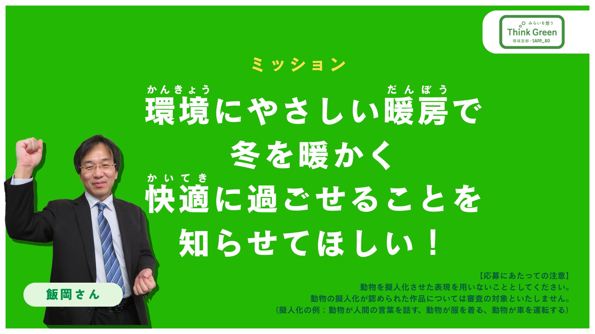 アンバサダーにはさっぽろテレビ塔の「テレビ父さん」や北海道コンサドーレ札幌の「ドーレくん」を迎え、審査員には、審査委員長である「札幌市長 秋元克広氏」をはじめとして各分野を代表する方々が参加。AOAO SAPPORO、石屋製菓など、札幌を代表する企業・団体の環境保全の取り組みを、子どもたちがPRするというプログラムを通じて、“環境首都・札幌”の実現に向けた機運を高めます。