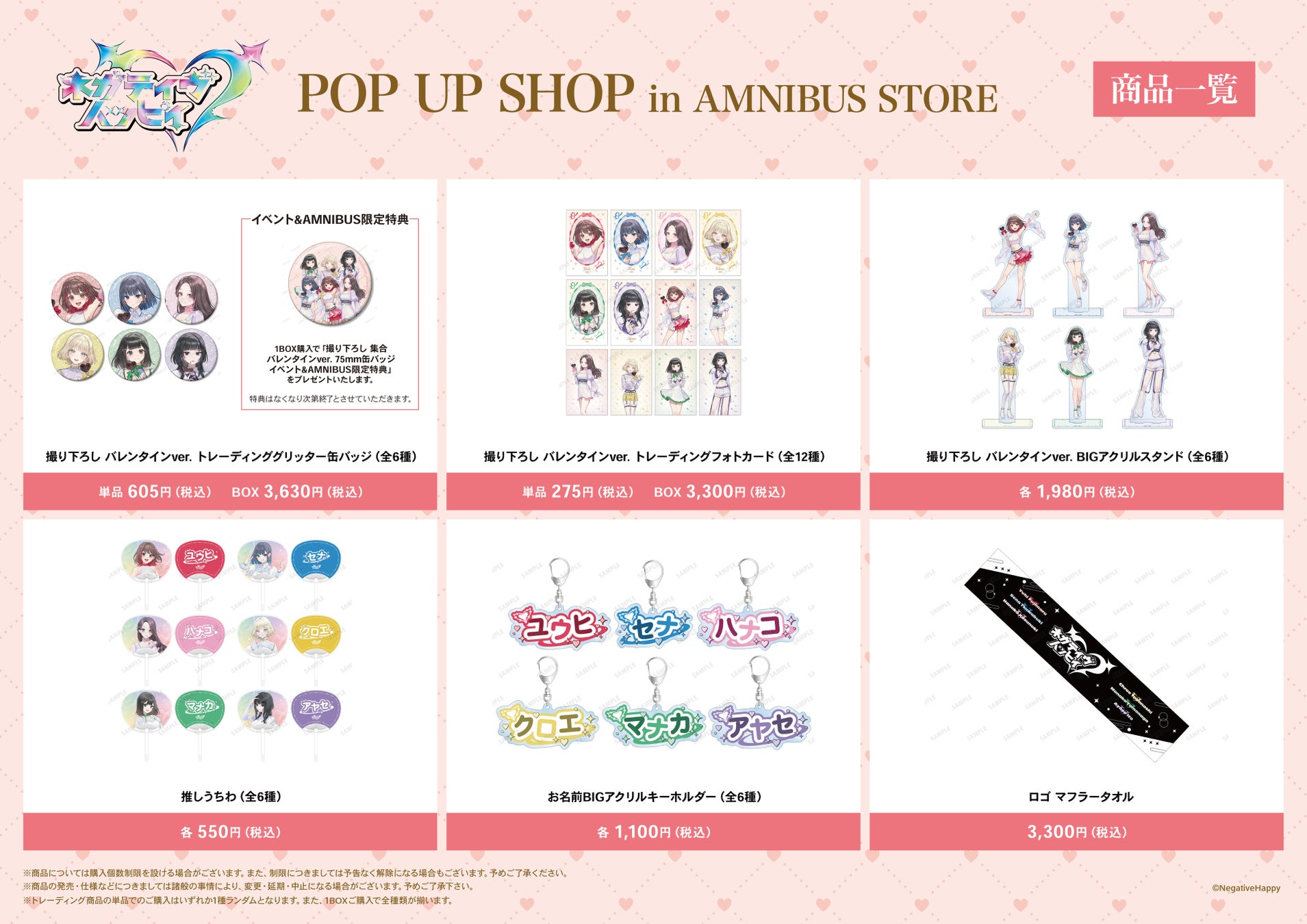 今回のイベントでは、『ネガティヴハッピィ』より「バレンタイン」をコンセプトにした新規撮り下ろしを使用したグッズを多数先行販売する他、AMNIBUS STORE購入特典の配布を予定しております。