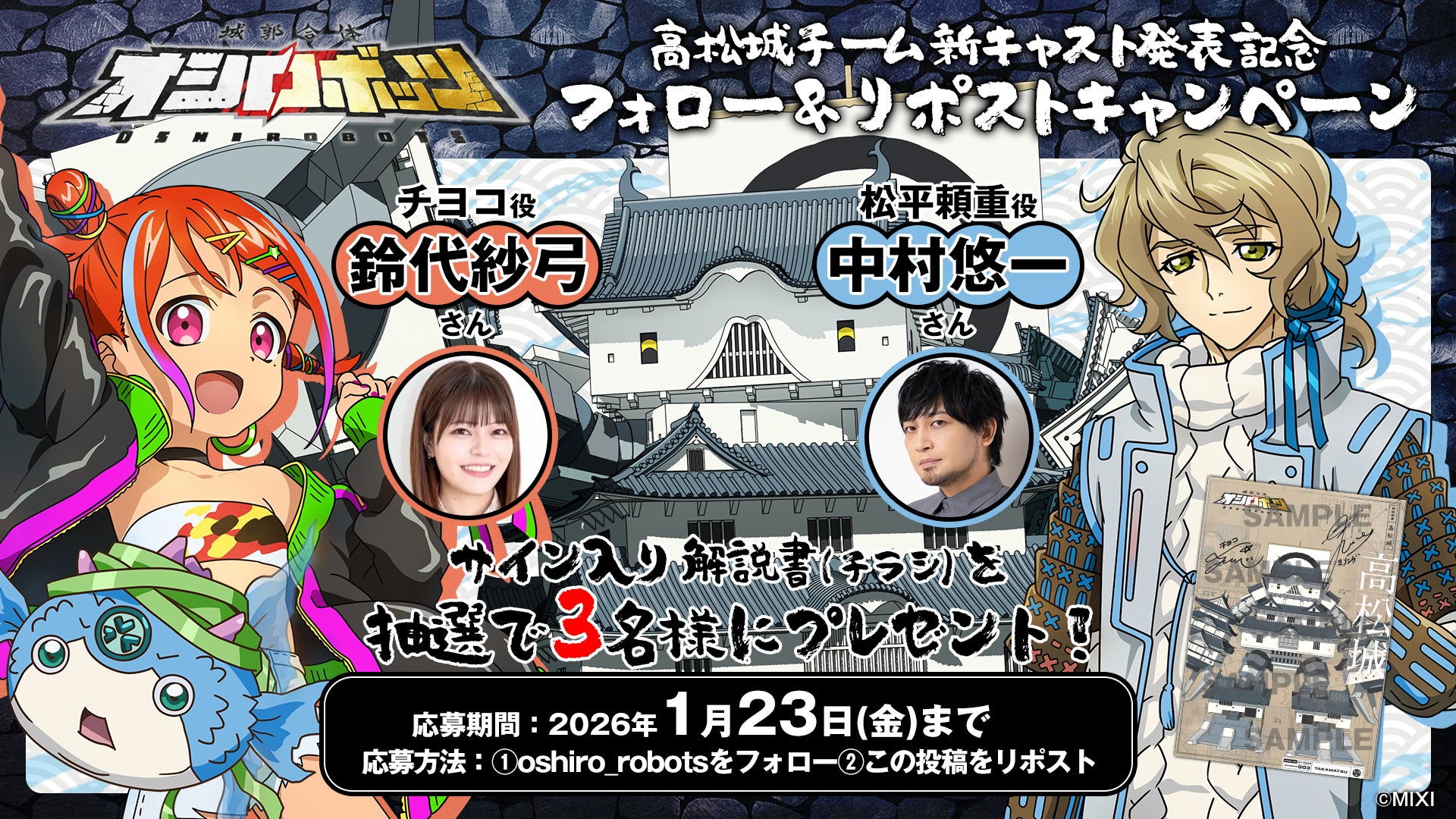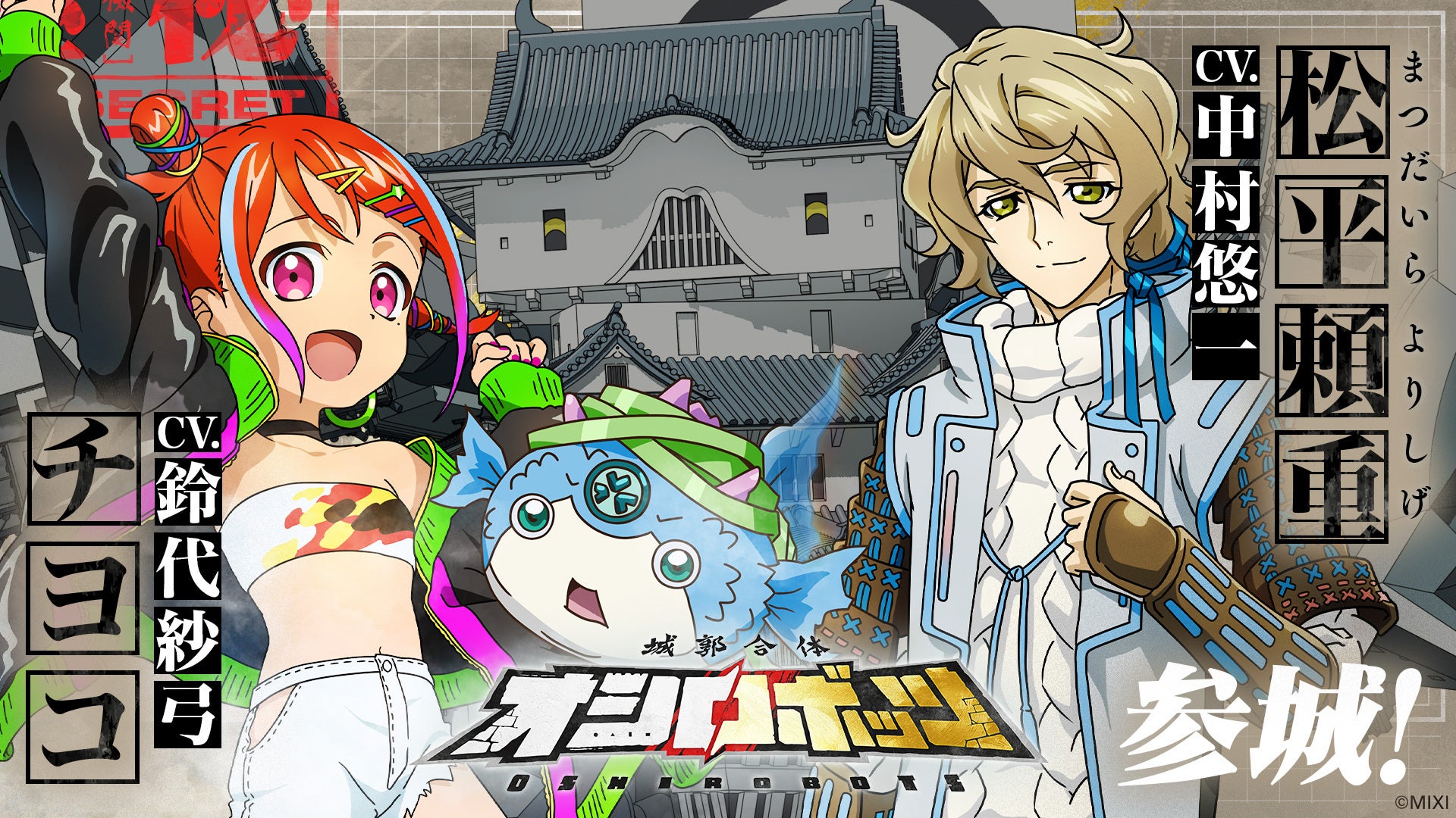 株式会社MIXI(東京都渋谷区、代表取締役社長 上級執行役員 CEO:木村 弘毅)は、MIXI_ANIMEオリジナルコンテンツ『城郭合体オシロボッツ』において、オシロボット高松城パイロット「チヨコ」役を鈴代紗弓さん、シロダマ(武将)「松平頼重」役を中村悠一さんが担当することをお知らせします。また、新たにセリフを加え、一部カットを再撮影した準新作映像も同時公開しました。キャスト発表を記念して、サイン入り解説書(チラシ)が抽選で当たるキャンペーンも実施します。今後も各オシロボットのパイロットおよびシロダマ(武将)のキャラクターボイス(CV) を順次追加していく予定です。