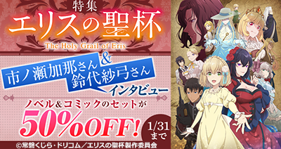 6,700作品以上のアニメが見放題(※)の「dアニメストア」( https://animestore.docomo.ne.jp/ )では、dアニメストアにて先行配信中のTVアニメ「エリスの聖杯」の特集を公開中です。特集では、メインキャラクターを演じる市ノ瀬加那さん・鈴代紗弓さんが作品の魅力を語ったインタビューを掲載。さらに、1月31日(土)までの期間限定で、同作品のコミック・ノベルが特別価格で購入できるキャンペーンを開催しています。アニメも電子書籍も、「エリスの聖杯」はdアニメストアでお楽しみください!