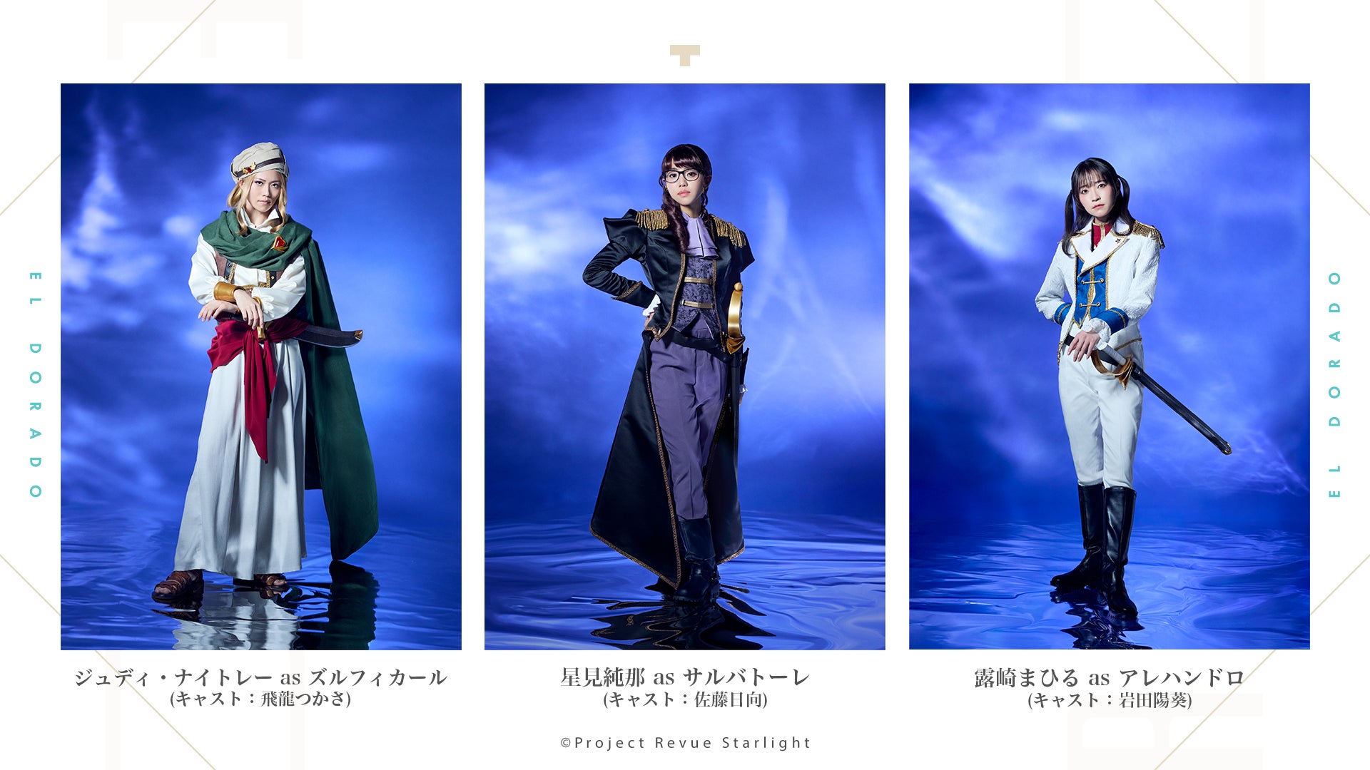 サルバトーレ役の佐藤日向さん、アレハンドロ役の岩田陽葵さん、ズルフィカール役の飛龍つかささんの全身ビジュアルを公開。