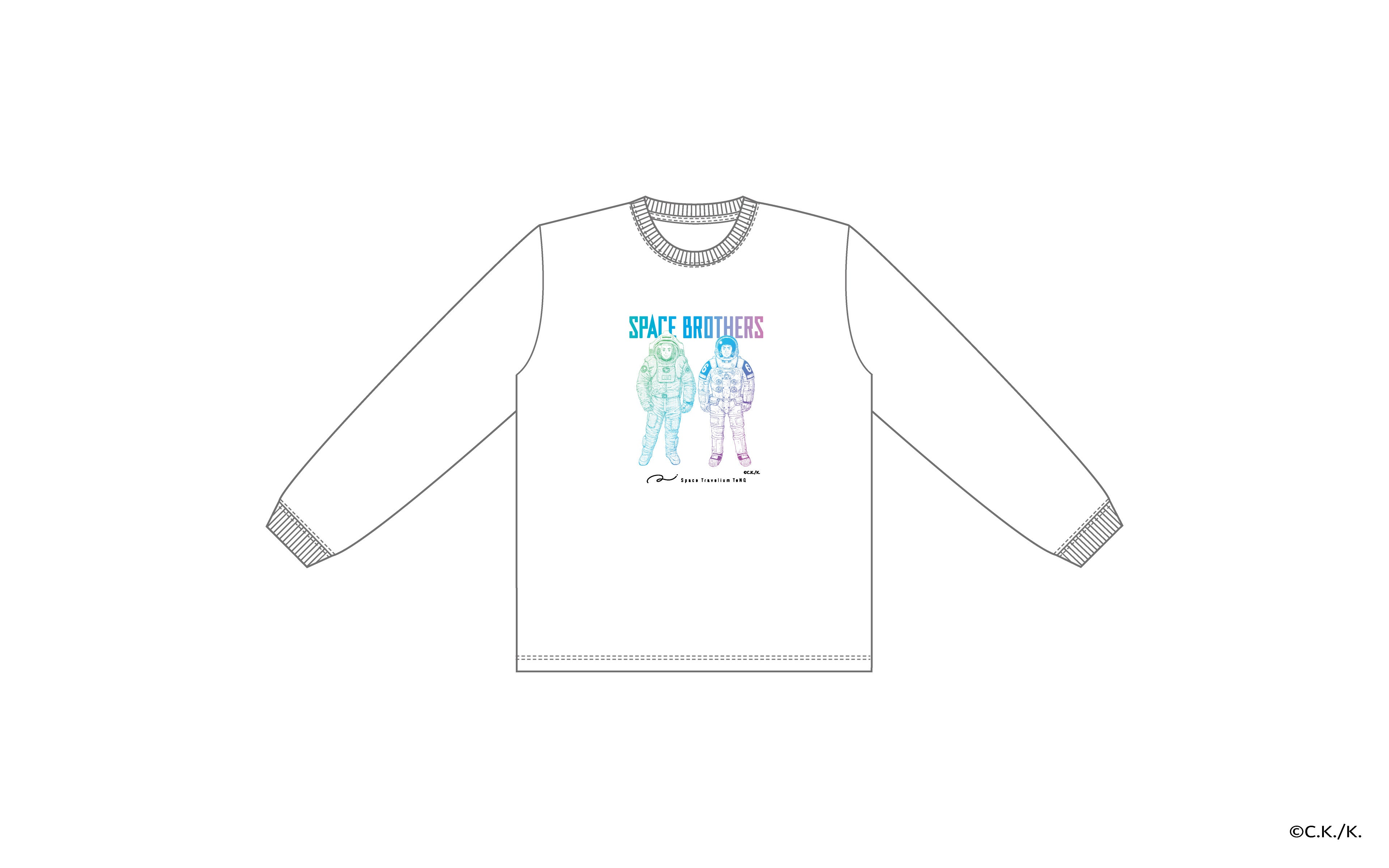 ホワイトカラーのフード付きパーカー。前面に「WHY CAN’T WE DO THIS MORE LIKE ASTRONAUTS?」(もっと宇宙飛行士気分で行こうぜ)を、裏面には六太の後ろ姿をデザインしました。