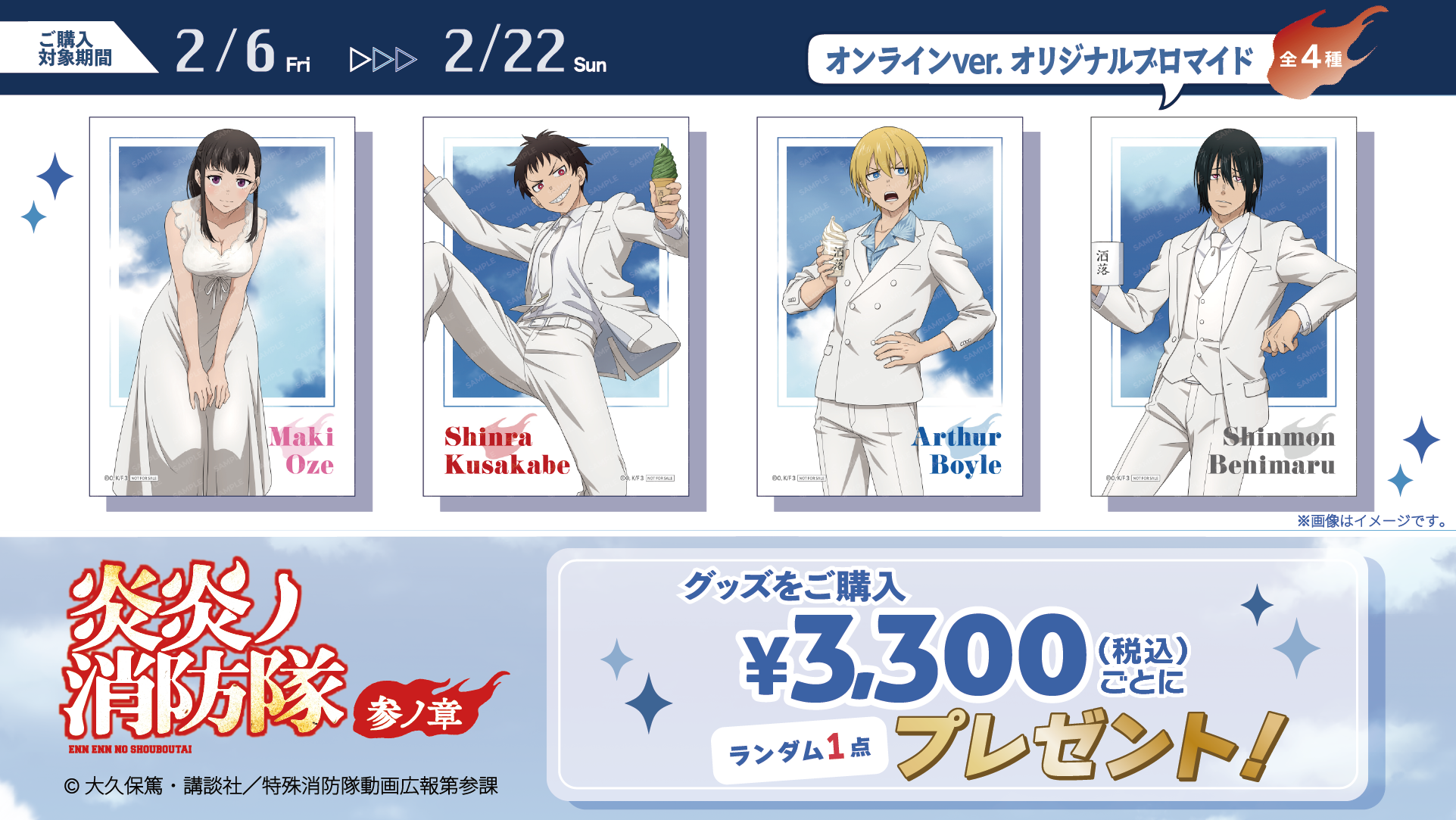 本イベントの描き下ろしイラストのテーマは、シンラ、アーサー、マキ、紅丸の4人が屋上で爽やかな白い衣装を身にまとった “ルーフトップ ” です。