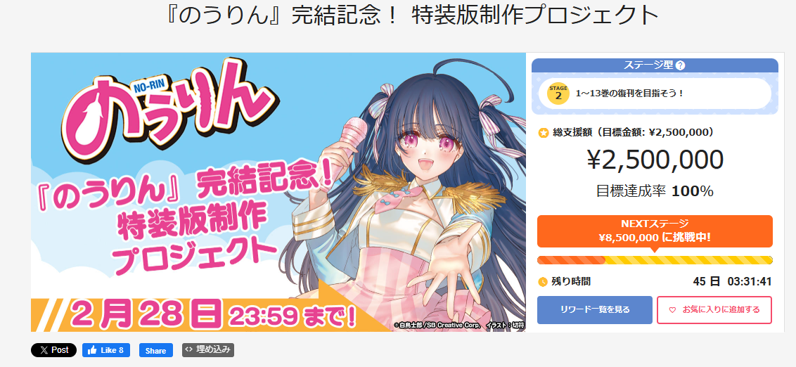 株式会社アニメイトが運営するクラウドファンディングサービス「ソレオス」にて開催中の【『のうりん』(GA文庫/SBクリエイティブ刊)完結記念!特装版制作プロジェクト】が1月14日に第1目標の250万円を突破し、14巻特装版の制作が決定。続いて第2目標の『のうりん』1巻~13巻の復刊に挑戦します。