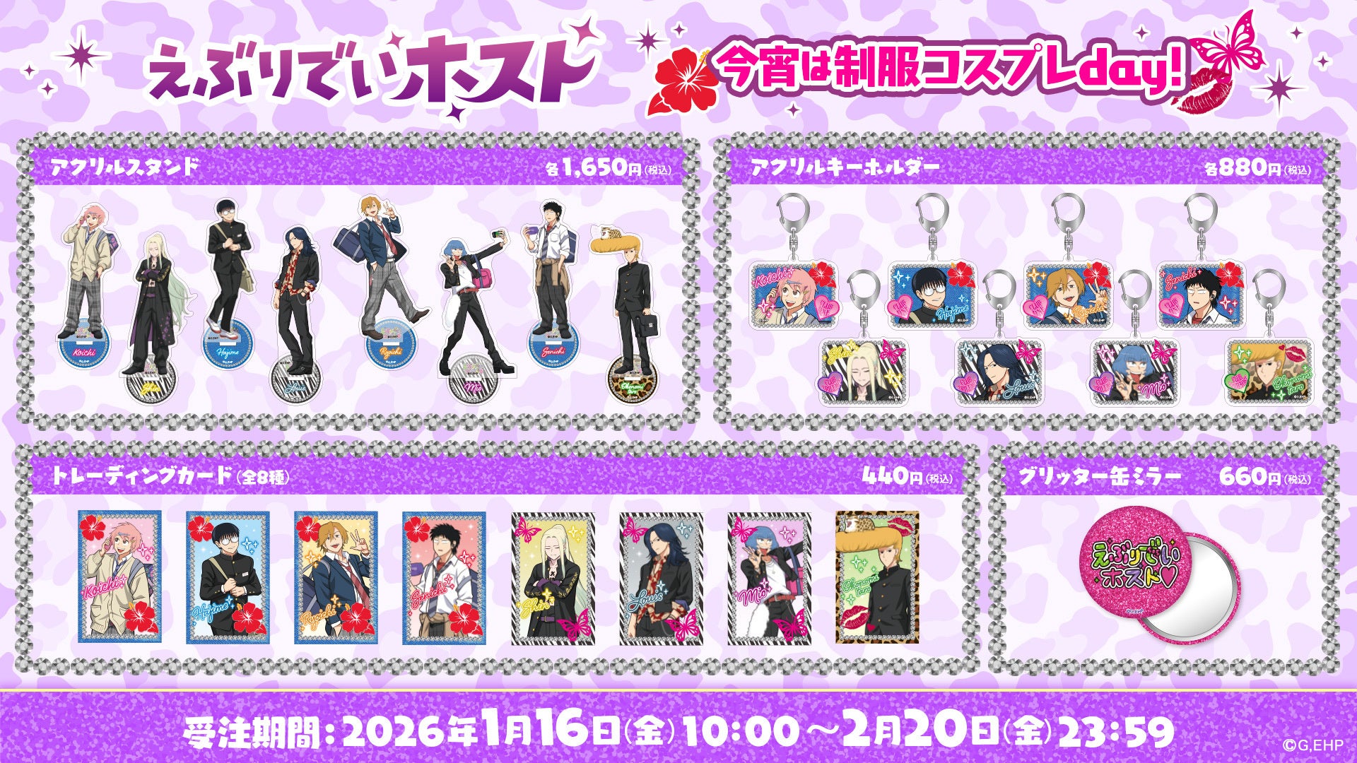 株式会社サイバーエージェント(本社:東京都渋谷区、代表取締役:山内隆裕、東証プライム市場:証券コード4751)は、TVアニメ『えぶりでいホスト』において、新規描き下ろしビジュアル「今宵は制服コスプレDay!」を使用したオリジナルグッズを2026年1月16日(金)より販売開始いたします。
