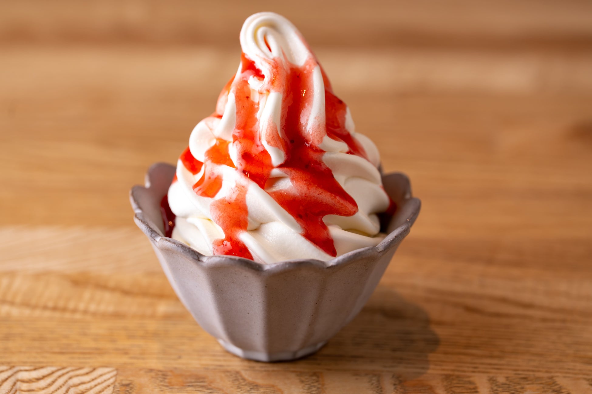濃厚な北海道ミルクソフトに、ストロベリーソースの赤がそっと重なる一品。作中で京本が着ている半纏をイメージしました。