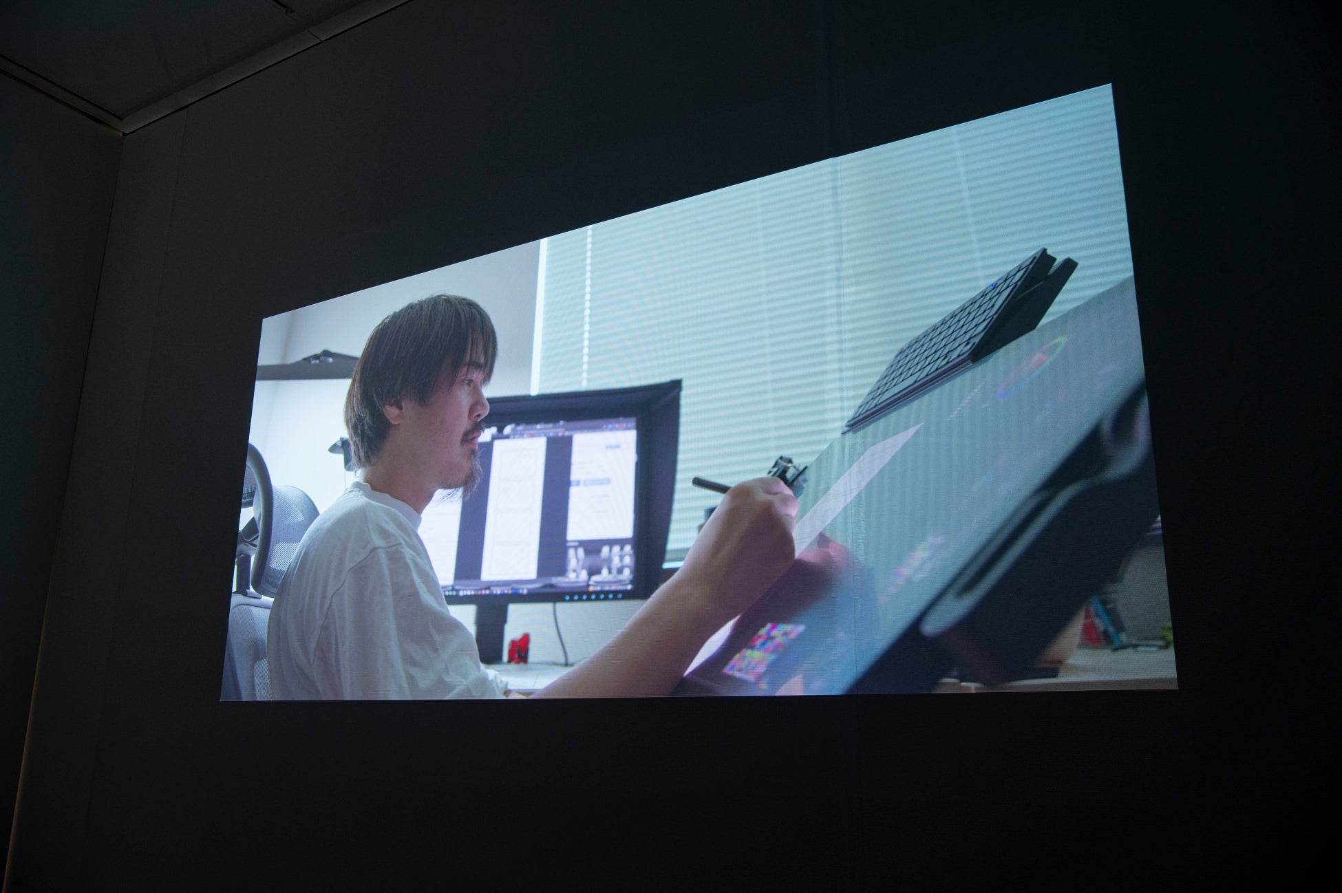 開幕イベントにて、押山監督が3Dドローイングを実施しました。押山監督がヘッドマウントディスプレイを装着し、会場内の空間に劇場アニメ『ルックバック』の中でも印象的なシーン「雨の中を疾走する藤野」のイラストをリアルタイムで描きました。「絵を描いていると楽しいだけでなく辛い時もあり、僕も描くことを休むこともあります。でもまたすぐに描きたくなる。雨の中を疾走する藤野は、そんな自分と重なるところがあると感じたので今回、描きました」と、思いのたけを語りました。