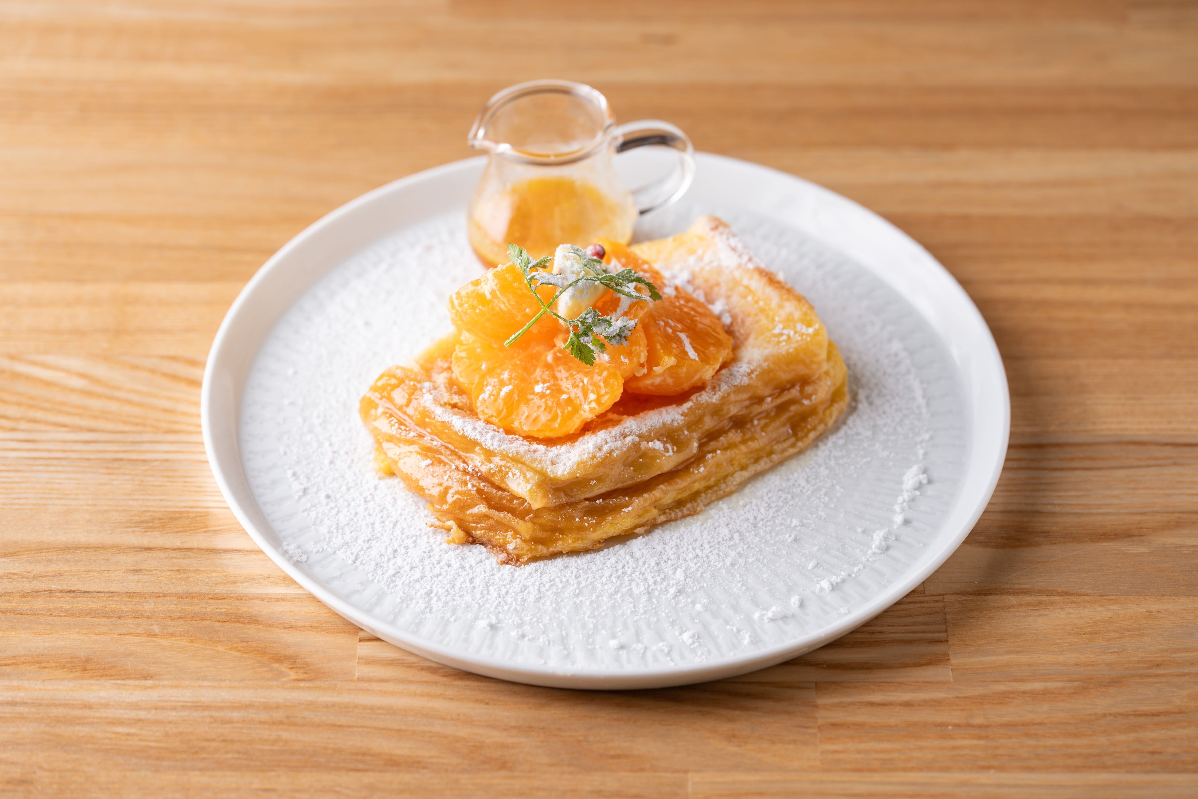 ペリカンカフェの人気メニューであるフレンチトーストを、作中の雪景色と象徴的なオレンジをモチーフに仕上げました。お好みでオレンジのソースをかけてお召し上がりください。