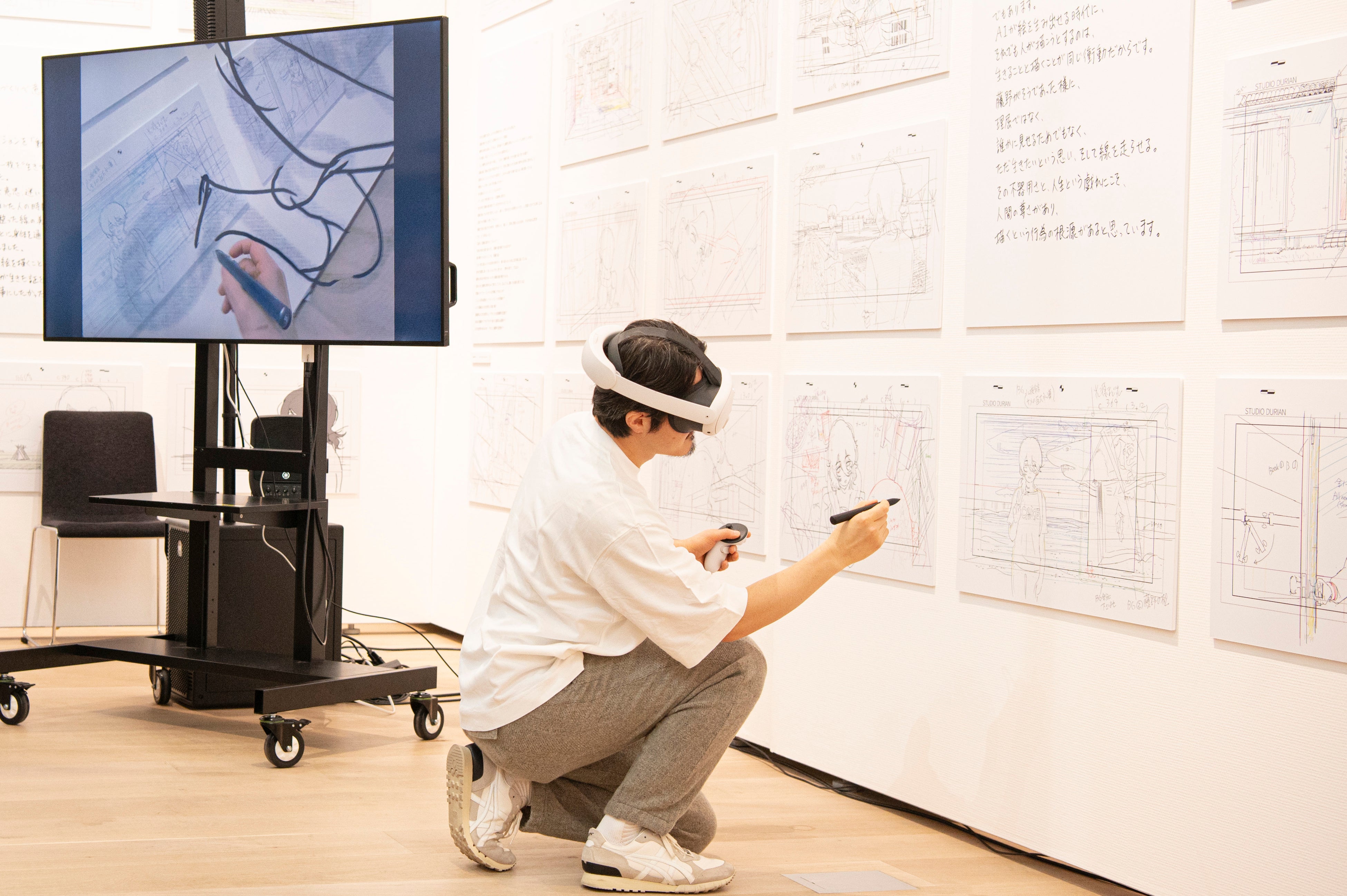 開幕イベントにて、押山監督が3Dドローイングを実施しました。押山監督がヘッドマウントディスプレイを装着し、会場内の空間に劇場アニメ『ルックバック』の中でも印象的なシーン「雨の中を疾走する藤野」のイラストをリアルタイムで描きました。「絵を描いていると楽しいだけでなく辛い時もあり、僕も描くことを休むこともあります。でもまたすぐに描きたくなる。雨の中を疾走する藤野は、そんな自分と重なるところがあると感じたので今回、描きました」と、思いのたけを語りました。