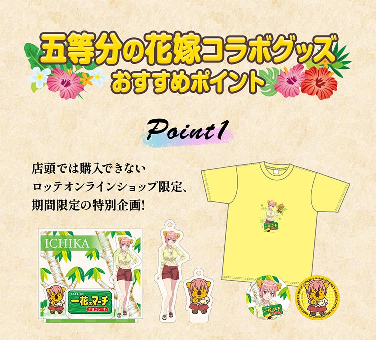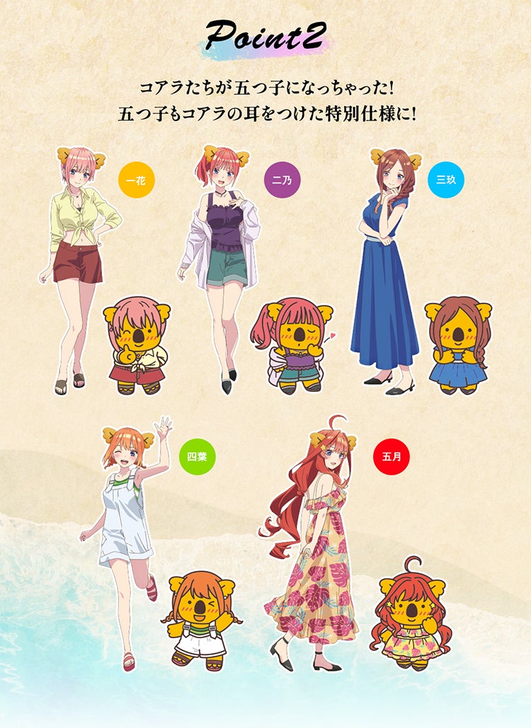 株式会社ロッテは1月19日(月)正午に、ロッテオンラインショップ限定でTVスペシャルアニメ『五等分の花嫁*』と『コアラのマーチ』のコアラたちがコラボした特別グッズを4種類販売いたします。TVスペシャルアニメ『五等分の花嫁*』のキャラクターが、コアラの耳をつけて大変身。さらに、各キャラクターをモチーフにしたコアラたちも登場します。ロッテオンラインショップにて、期間限定・受注生産となります。ぜひ詳細をご覧ください!
