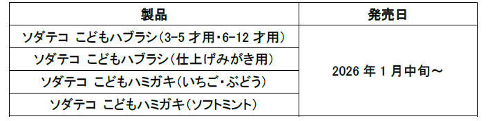 今回発売する製品は、正しいハブラシの持ち方で歯をみがく習慣を促す「ソダテコ こどもハブラシ」と、むし歯・歯の着色・おくち全体の汚れ・歯石の沈着・プラーク(歯垢)の付着・口臭の6大リスク※2をトータルケアするための「ソダテコ こどもハミガキ」の2種類です。販売先は、現地のドラッグストア、百貨店、輸入品スーパーマーケット、ライフスタイルECサイトを予定しています。また、台湾で高い人気を誇る株式会社ベネッセコーポレーション「こどもちゃれんじ」のキャラクター「しまじろう」を活用したプロモーションを通じて、毎日の歯みがきがお子さまにとって楽しい習慣になるようアシストします。