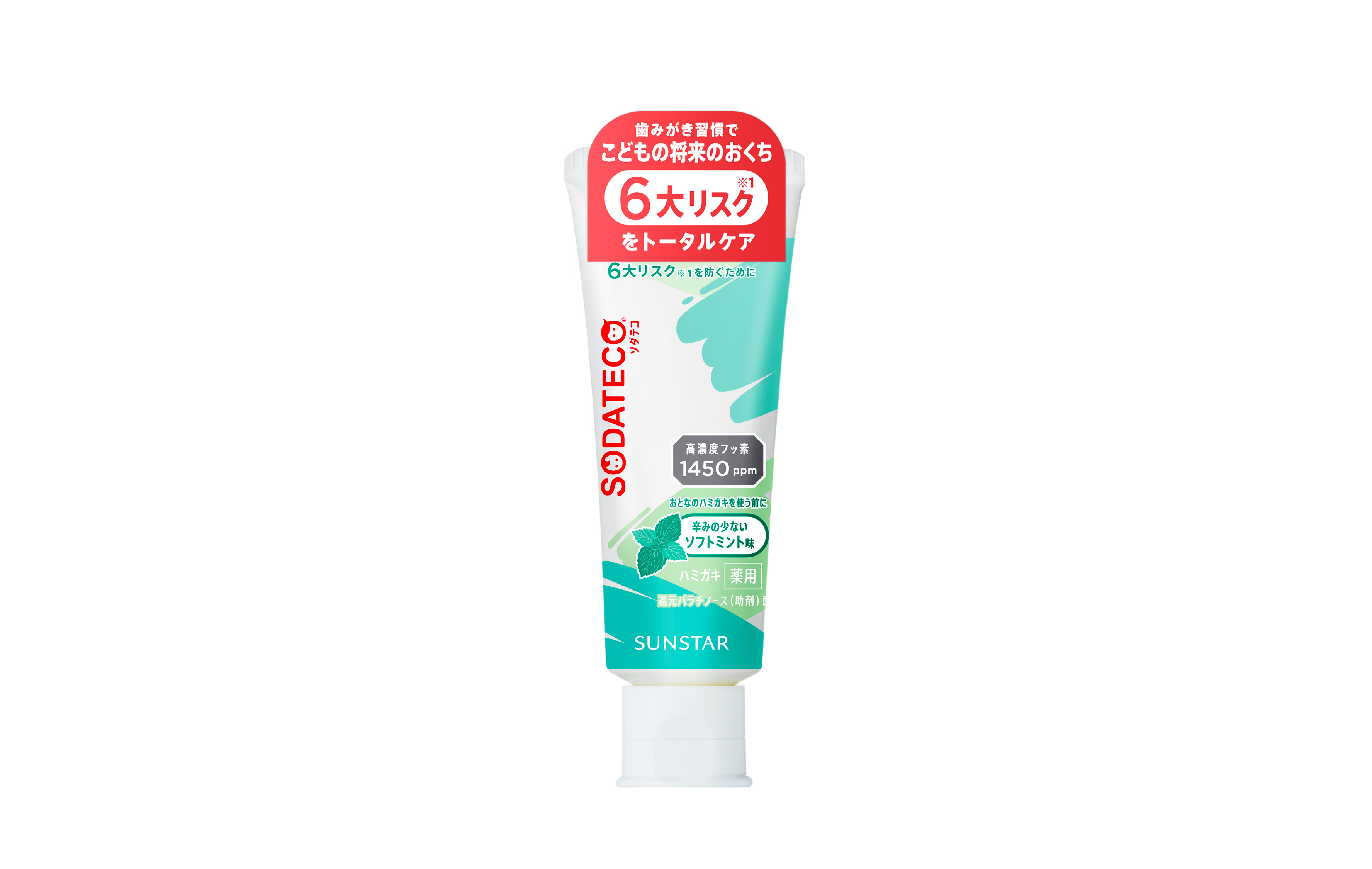 子どもの将来のおくち6大リスク※2を、歯みがき習慣でトータルケア。薬用成分フッ素1450ppm配合。歯へのカルシウムの取り込みを促進して、歯質を強化し、むし歯を予防します。大人用のハミガキを使う前のお子さま向けに辛味の少ないソフトミント味です。