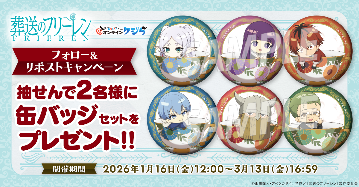 オンラインクジら公式アカウント(@_onlinekujira)と『葬送のフリーレン』アニメ公式アカウント(@Anime_Frieren)をフォロー&対象のポストをリポストすると、缶バッジセットを抽選で2名様にプレゼント。