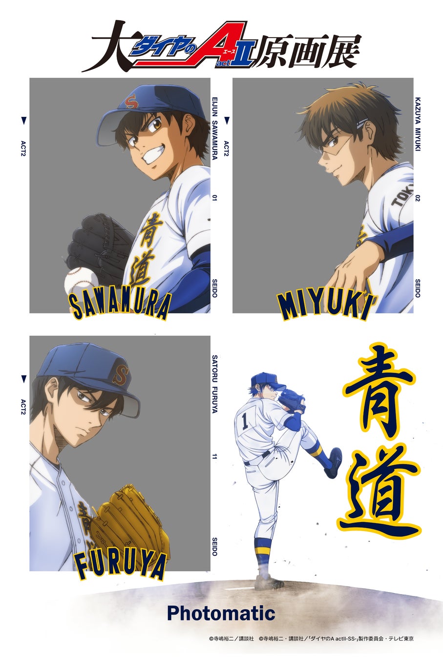 コラボフレームは、『ダイヤのA』シリーズのメインキャラクターである沢村栄純、御幸一也、降谷暁と一緒に写真に収まることができる「ツーショット風」のデザインとなっております。作品の世界観を感じながら、特別な撮影体験をお楽しみいただけます。 ぜひ原画展で作品の情熱に触れた感動を、思い出の1枚としてお持ち帰りください。
