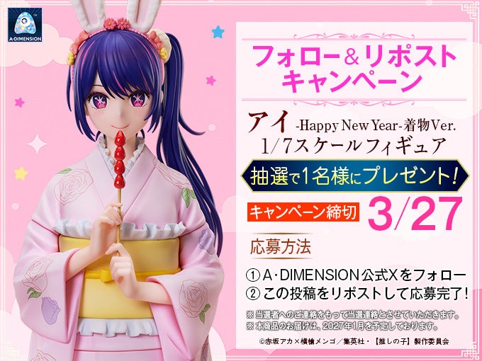 [商品名] 【推しの子】アイ -Happy New Year- 着物Ver. 1/7スケールフィギュア [予約場所] ECサイト『A・DIMENSION』 https://a-dim.com/ [予約期間] 2026年1月21日(水)10:00 ~ 2026年3月27日(金)23:59 [発売日] 2027年1月(予定) [価格] 16,800円(税別)/18,480円(税込) [サイズ] 全高:約252mm (台座含む) [原型・彩色制作] デザインココ [発売元・販売元] 株式会社A・DIMENSION [コピーライト表記] ©赤坂アカ×横槍メンゴ/集英社・【推しの子】製作委員会<X(旧 Twitter)フォロー&リポストキャンペーンについて>