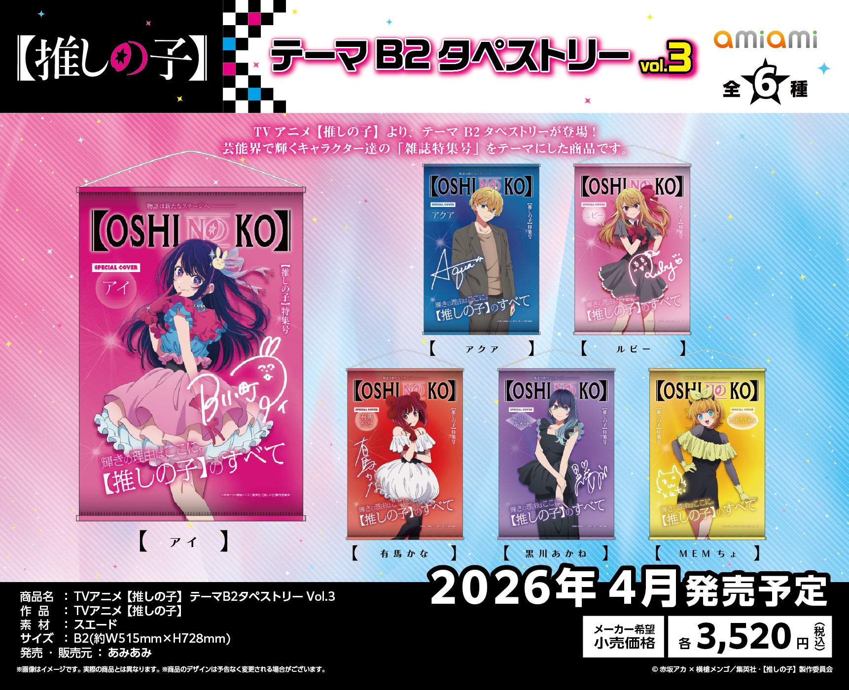 フィギュア&ホビー通販大手の「あみあみ」を運営する、大網株式会社(本社・東京都文京区)は、TVアニメ『【推しの子】』の「テーマB2タペストリー Vol.3」「テーマアクリルキーホルダー Vol.3」を、2026年4月予定で発売いたします。
