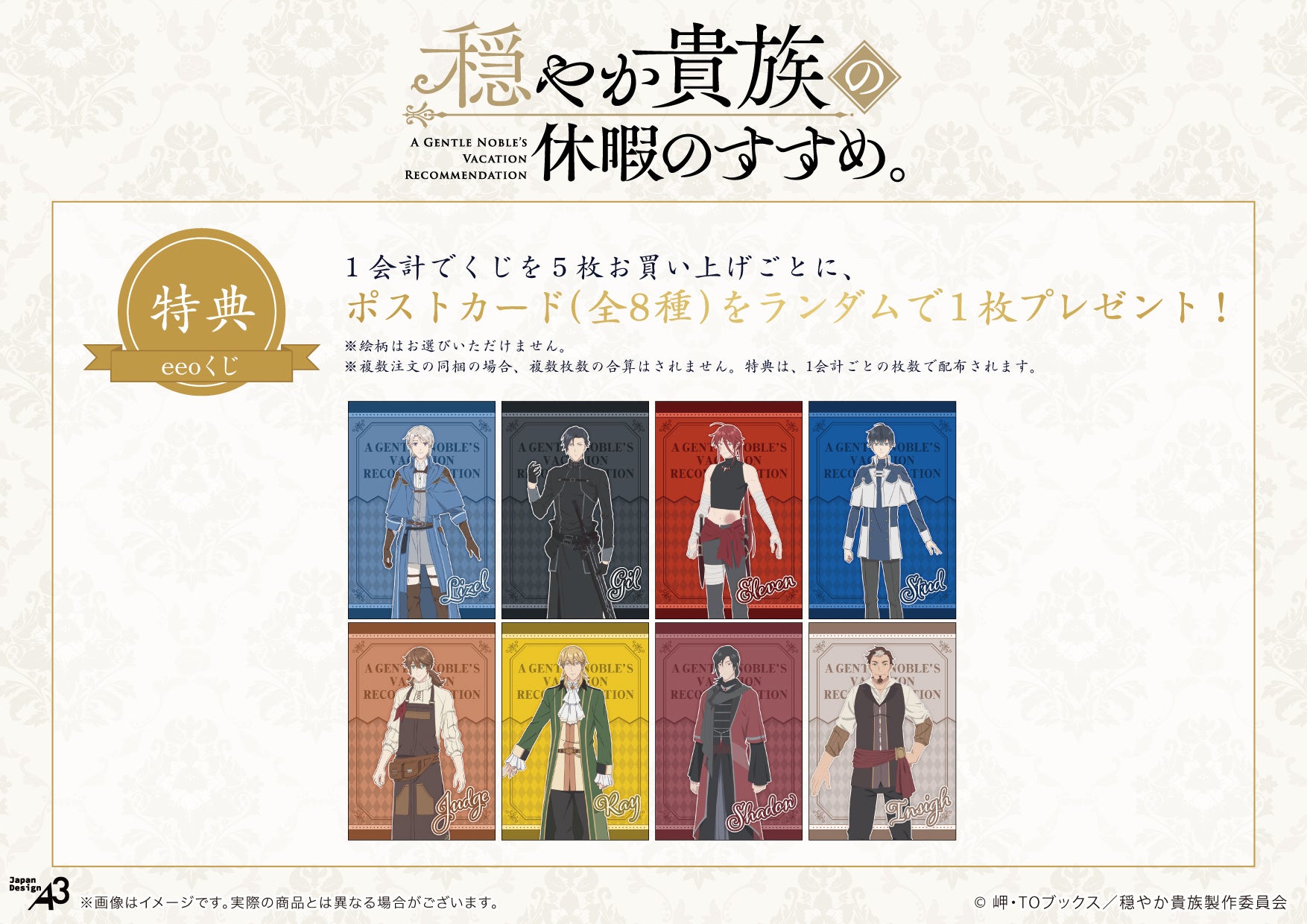 TVアニメ『穏やか貴族の休暇のすすめ。』の「eeoくじ」を1会計で5枚ご購入ごとに、ポストカード(全8種)をランダムで1枚プレゼント!