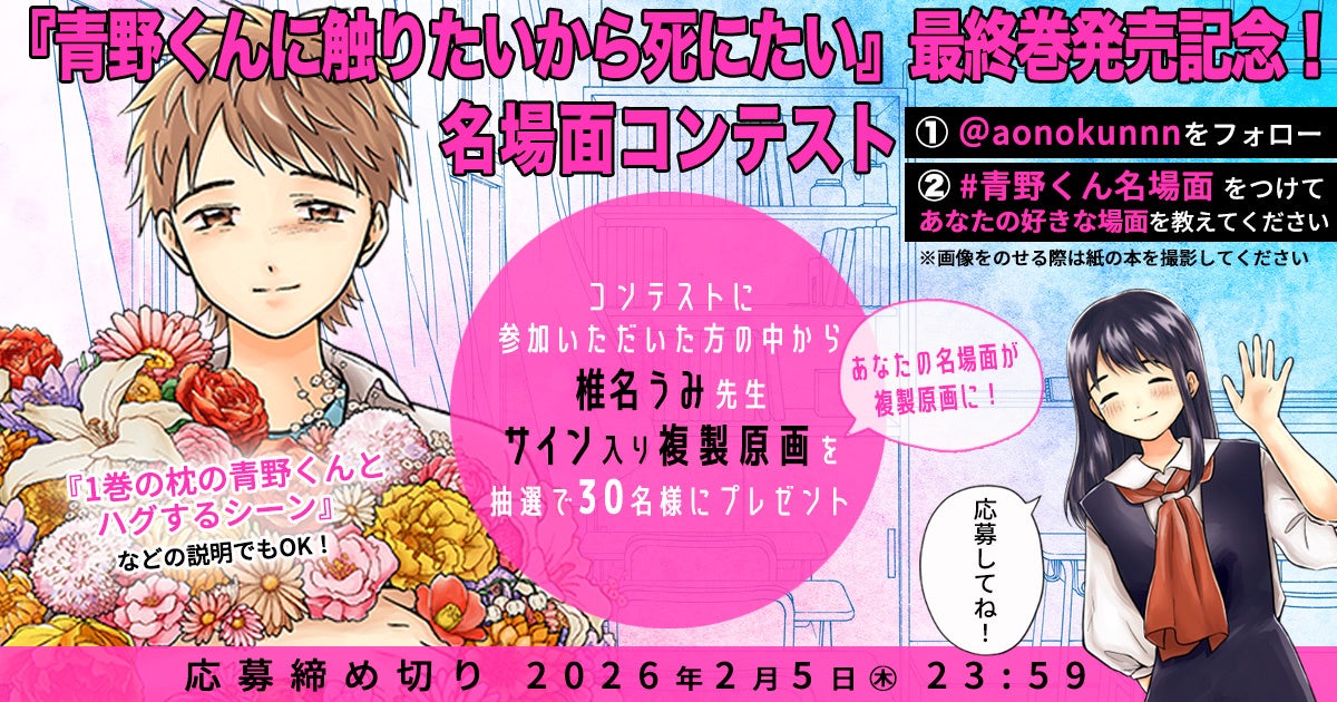作品公式Xでは「名場面コンテスト」も実施。あなたの心に残る『青野くんに触りたいから死にたい』の名場面をぜひ教えてください。コンテストにご参加いただいた方の中から抽選で30名様に、椎名うみ先生サイン入り複製原画をプレゼント!